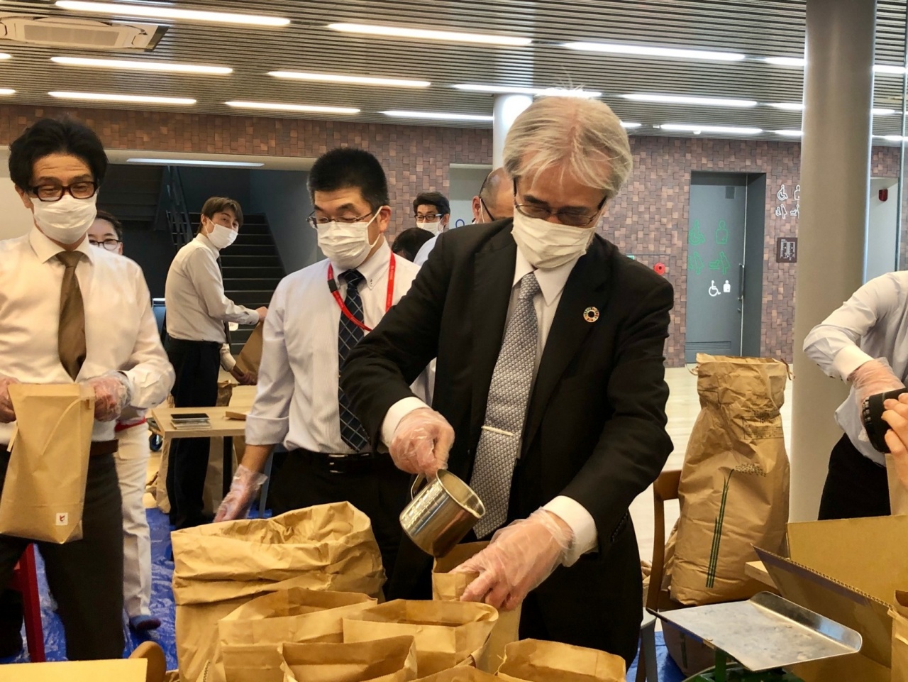 全てが手探りの中、学外協力業者の手配、必要資材の調達、食料仕分けなどの食支援スキーム構築のために、自然に集い共に汗をかいた教職員の姿は、まさに「自省利他」の実践であり、学生を大切にする志が個々の構成員に浸透している活動となりました。