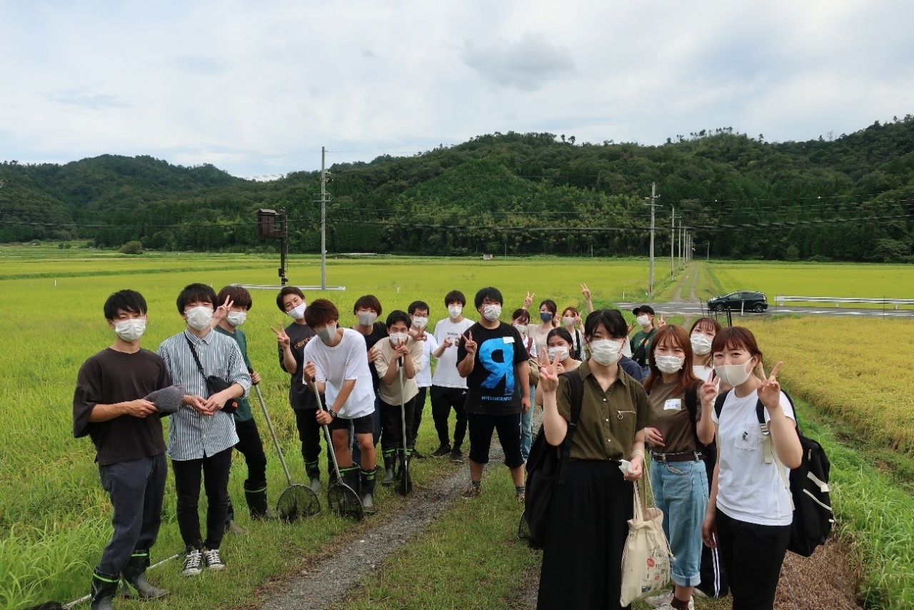 当日は晴天に恵まれ、森本区、三重区の公民館周辺の集落・水田などをあるき、地域の様子を知るとともに、ゲンゴロウ水田での生き物調査を行いました。新型コロナ感染防止対策を十分おこない、残念ながら地域の方との交流はしない形での訪問となりました。それでも今回初めて地域を訪問する学生が19名で、地域を実際にあるきながら地域資源を知ることができるという本当に待ちに待った有意義な機会であり、さらにプロジェクト学生同士も(4月からオンライン講義だったため)ようやく対面する機会でもありました。