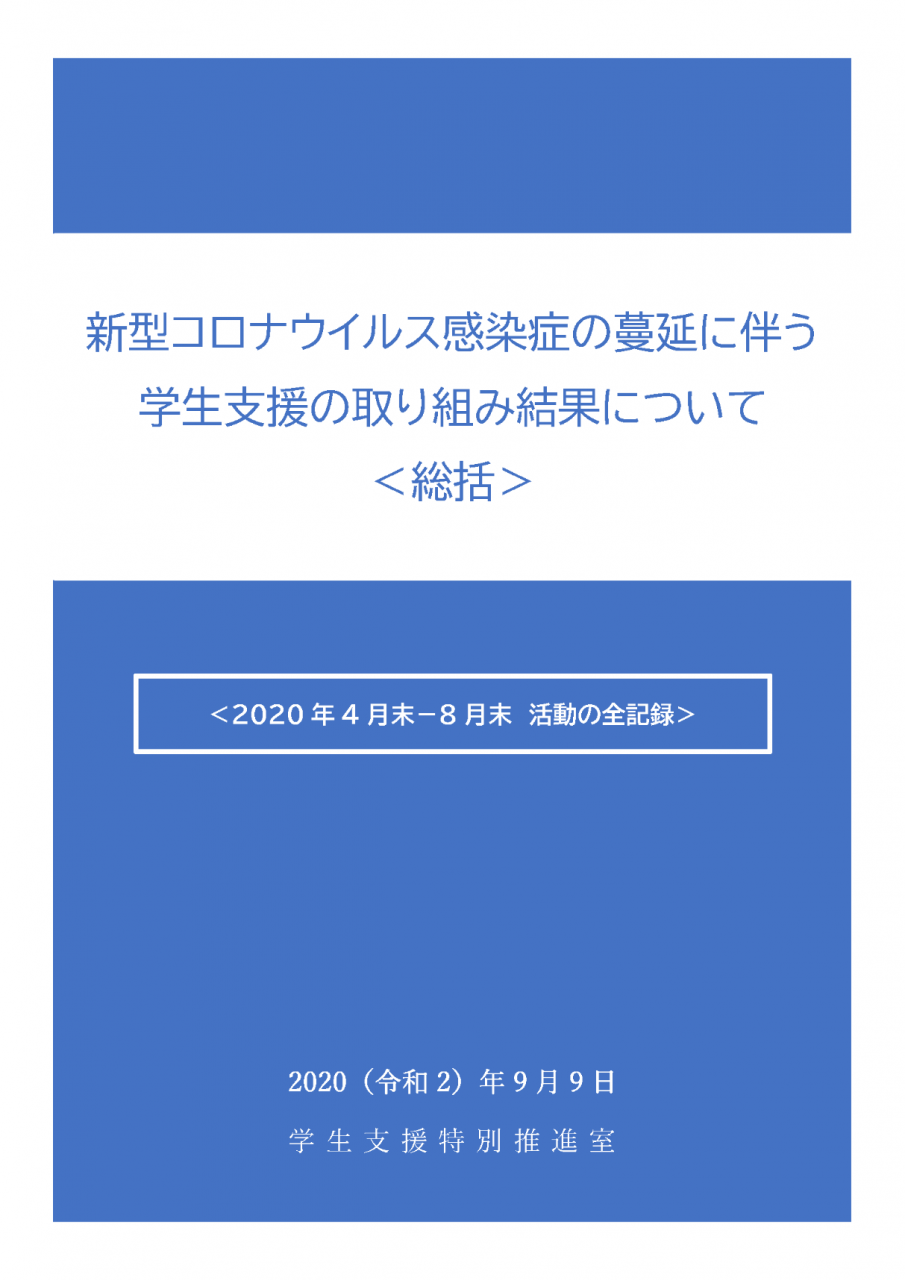 これを一つの区切りに、COVID-19にかかる学生支援活動として、これまでの約3ヶ月半の間に取り組んだ諸事業を総括し、その詳細をとりまとめました。