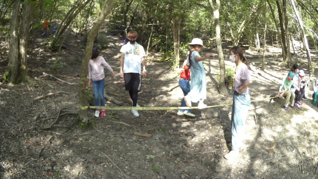 様々な場面や対処法を学び、意識して森の中へ入っていきました。森の中では、ロープで作った手作りのブランコや滑車のスライダー、スラックラインを使って遊びました。