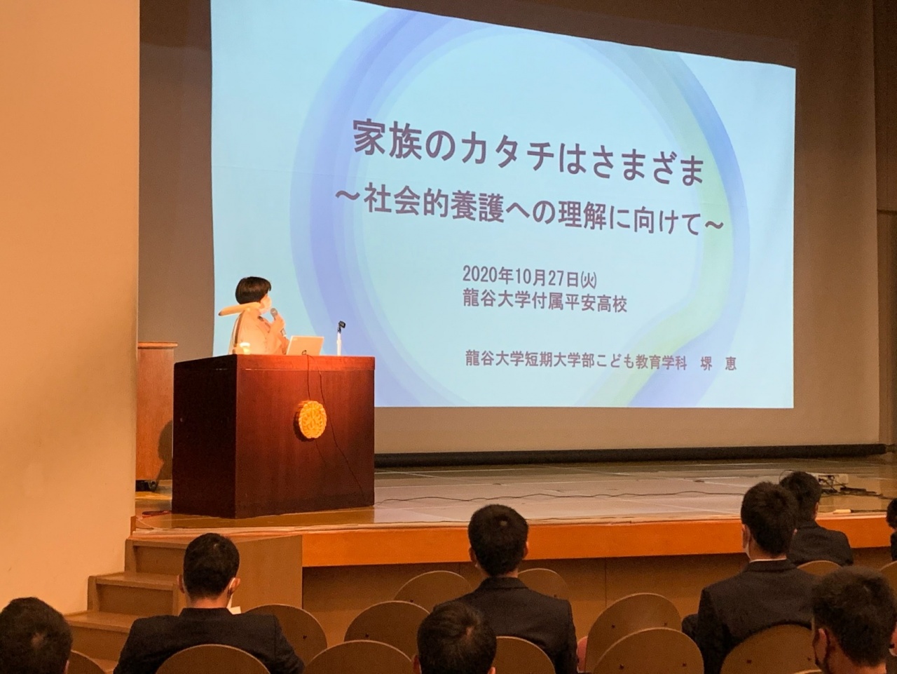龍谷大学付属平安高校で10月27日、教科「現代を学ぶ」の一環として短期大学部こども教育学科の堺恵准教授(社会福祉学)が「家族のカタチはさまざま~社会的養護への理解に向けて~」をテーマに授業を行いました。3年生を対象にした「現代を学ぶ」は、本学と付属平安高校との高大連携教育プログラムで、前回の安周永・政策学部准教授の授業に続き、今年度2回目の開催となります。