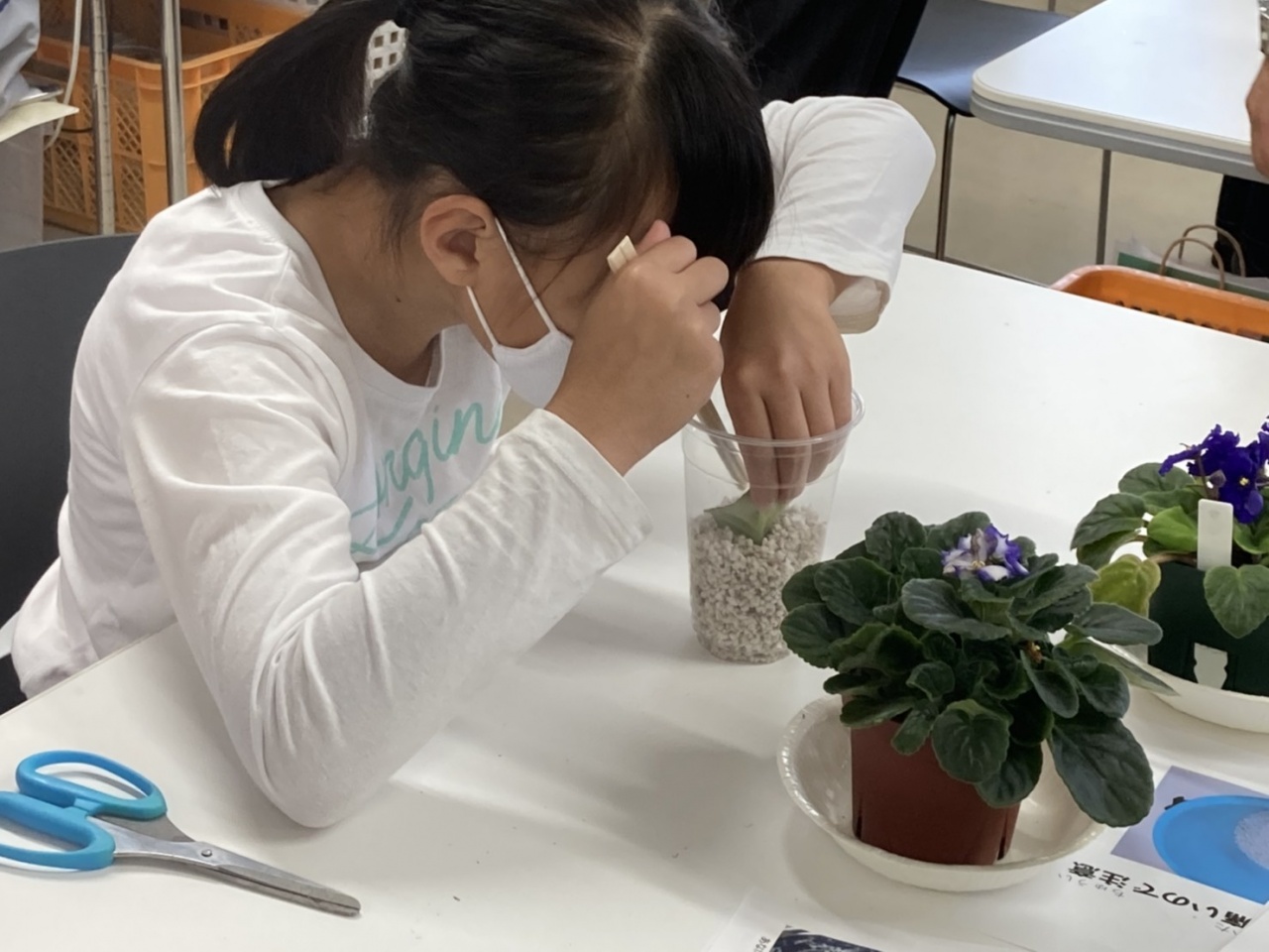 農学部資源生物科学科 神戸敏成教授、吉良徹農場技術専門助手、吉村大輔農場技術専門助手、妹尾拓司農場技術専門助手の指導のもと、セントポーリアの葉身を用いた葉挿し方法を体験し、作物を育てる「いのち」の授業を行いました。