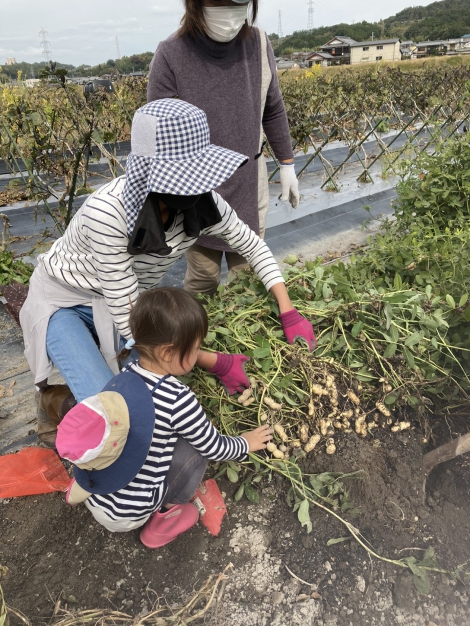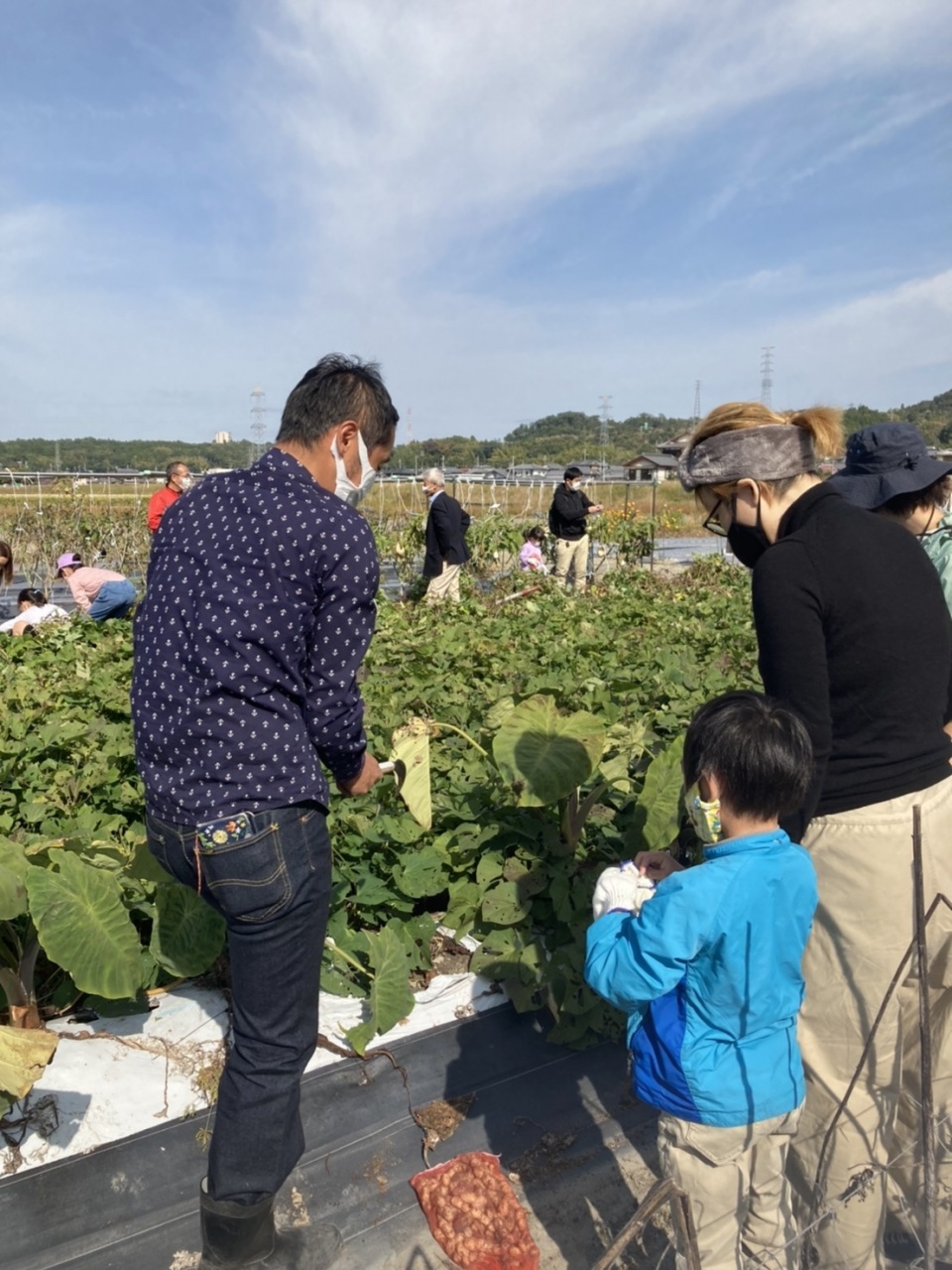 葉挿しの体験後は、実習農場で、落花生や里芋、サツマイモの収穫を行いました。通常の落花生より約2倍おおきな「おおまさり」という品種の落花生に歓喜の声が上がりました。