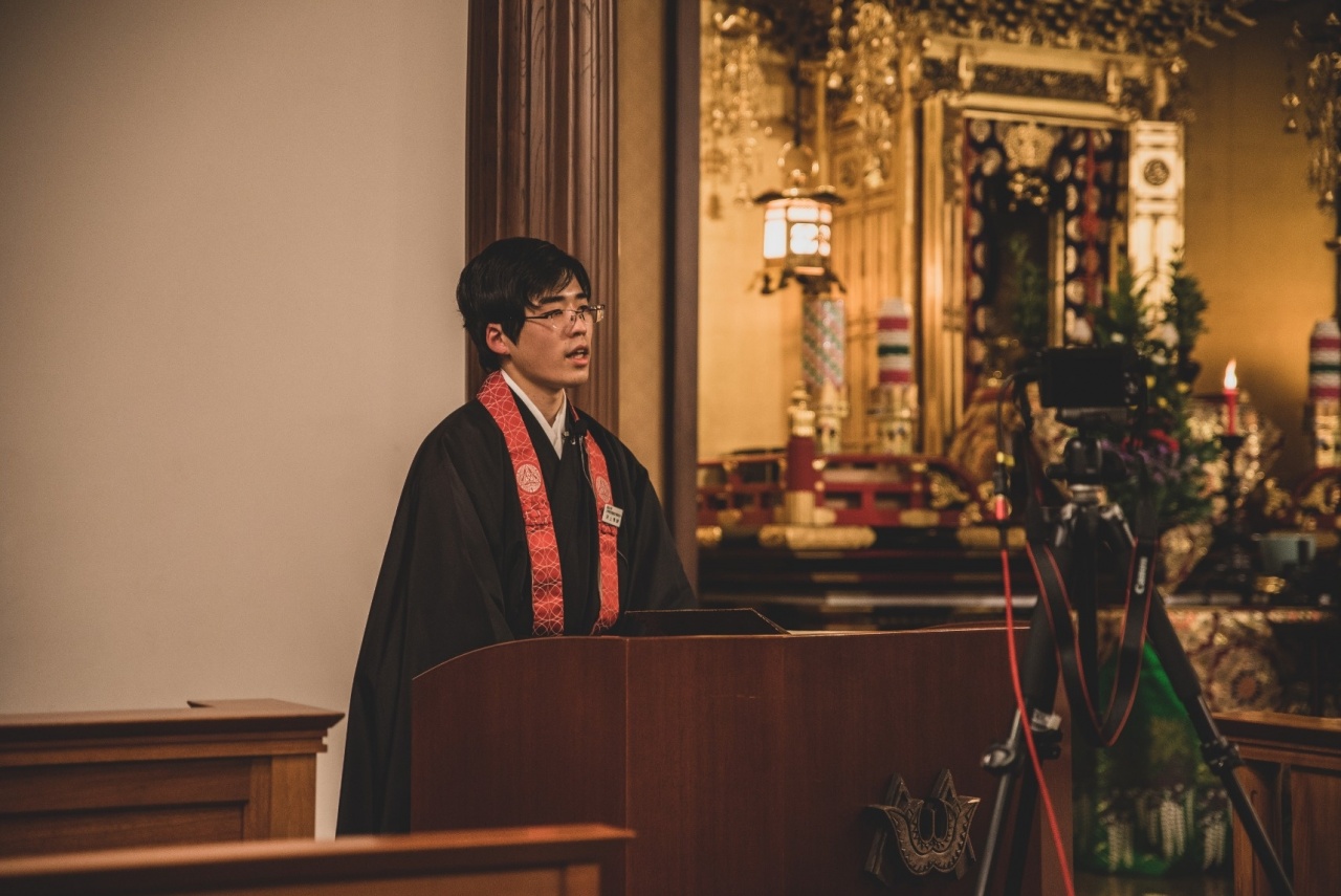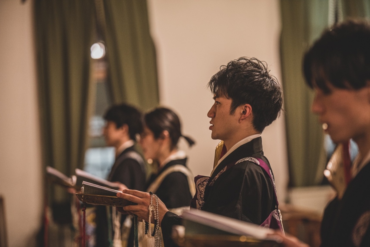 本年度は宗祖讃仰作法 音楽法要に続きまして、森田眞円教授、3回生河上秀朗さんよりご法話を頂戴いたしました。