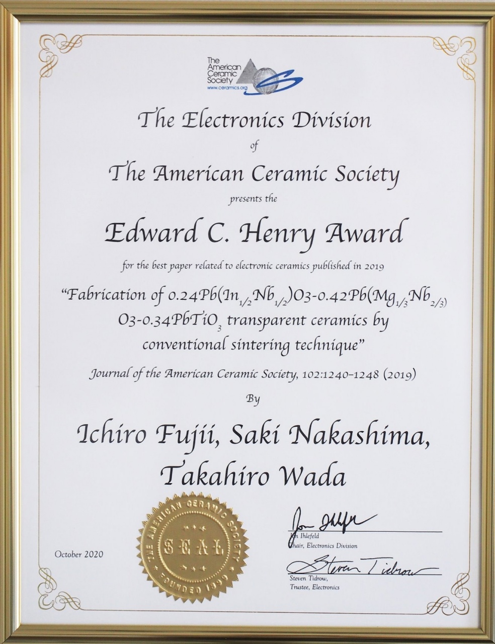 Edward C. Henry Award は、2019年にアメリカセラミックス協会の論文誌「Journal of the American Ceramic Society」または「Bulletin」に掲載された電子セラミックスに関する論文の中から同協会の電子材料部門により選出された最も優れた論文に贈られる賞です。