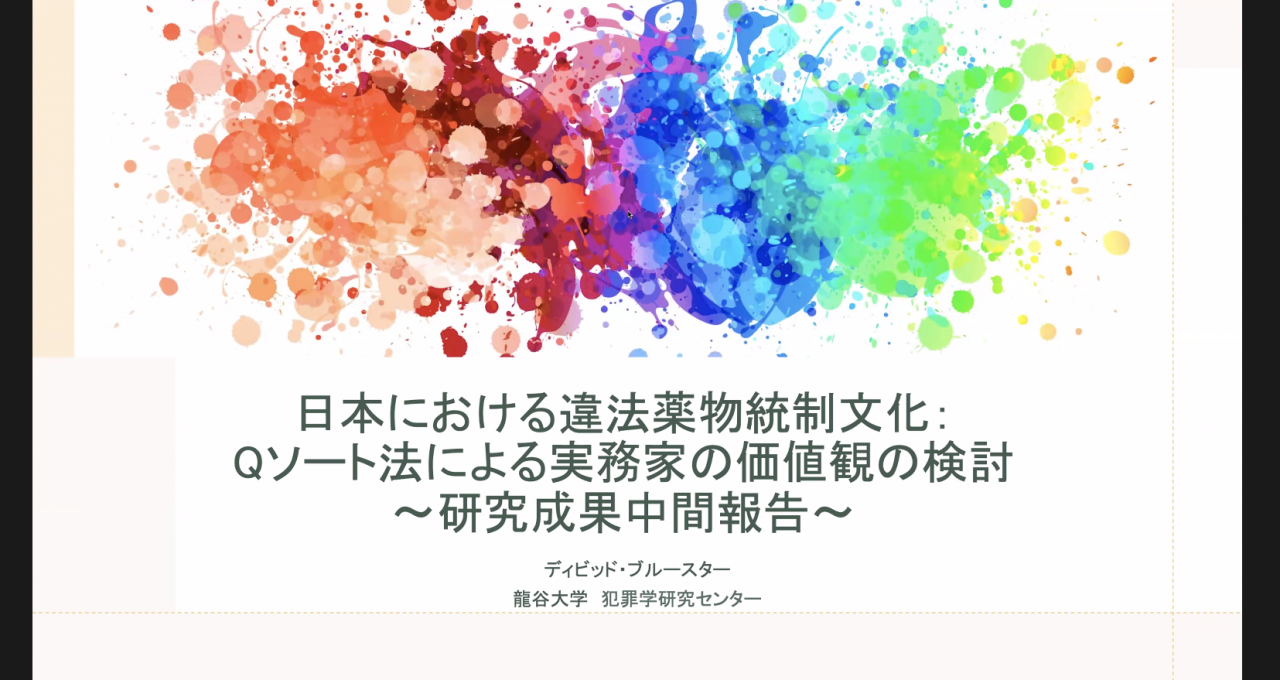 2021年1月16日、龍谷大学 犯罪学研究センター 博士研究員のディビッド・ブルースターは、研究成果中間報告をオンライン上で開催し、調査・研究関係者約20名が参加しました。