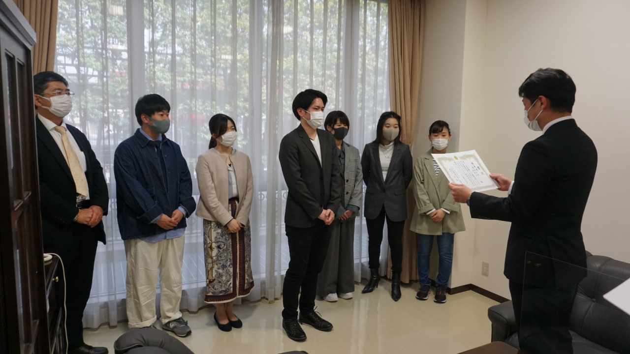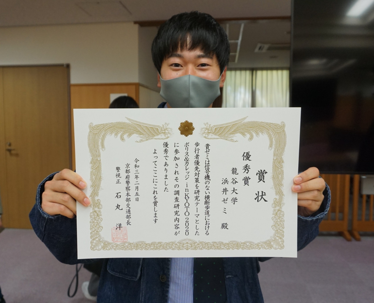 2018年度から開始し今年度で3回目の開催となる、「ポリス&カレッジ in KYOTO 2020 ~信号機のない横断歩道における歩行者優先対策~(京都府警察主催)」が2月5日にオンラインにて開催され、京都の5大学6チームが出場する中、法学部浜井ゼミ(3回生)が優秀賞を受賞しました。その後、3月30日に京都府警察本部の方々が大学へお越し頂き、表彰式を行いました。