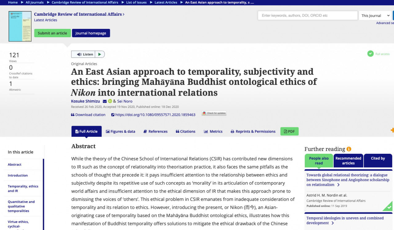 Cambridge Review of International Affairs誌に、本研究センター研究員の清水 耕介教授(国際学部 グローバルスタディーズ学科)と野呂 靖准教授(文学部 仏教学科)の仏教SDGs関連の共著論文 “An East Asian approach to temporality, subjectivity and ethics: bringing Mahāyāna Buddhist ontological ethics of Nikon into international relations”(時性、主観性および倫理への東アジア的アプローチ:大乗仏教の存在論的倫理・而今の国際関係への展開)が掲載されました。