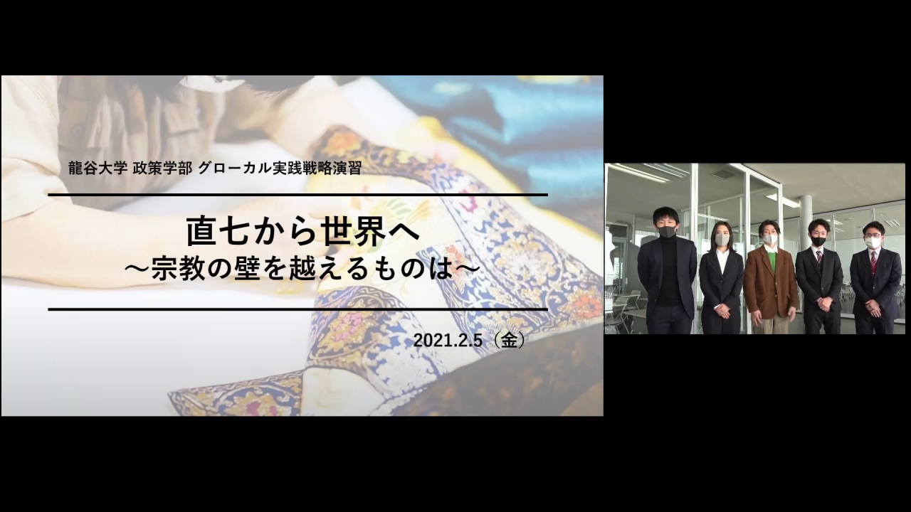 2021年2月26日(金)に第8回グローカル人材フォーラムがオンラインで開催され、政策学部「グローカル戦略実践演習」(企業連携型PBL科目)の受講生17名が参加し、龍谷大学政策学部『チームMISO』(連携先:株式会社西京味噌)が最優秀賞を受賞、『直七から世界へ』(連携先:株式会社直七法衣店)が、優秀賞を受賞しました。