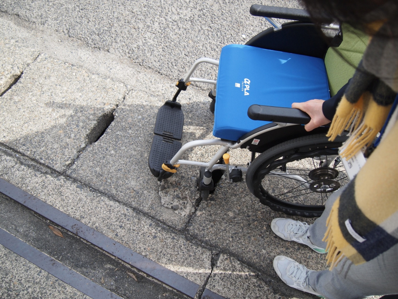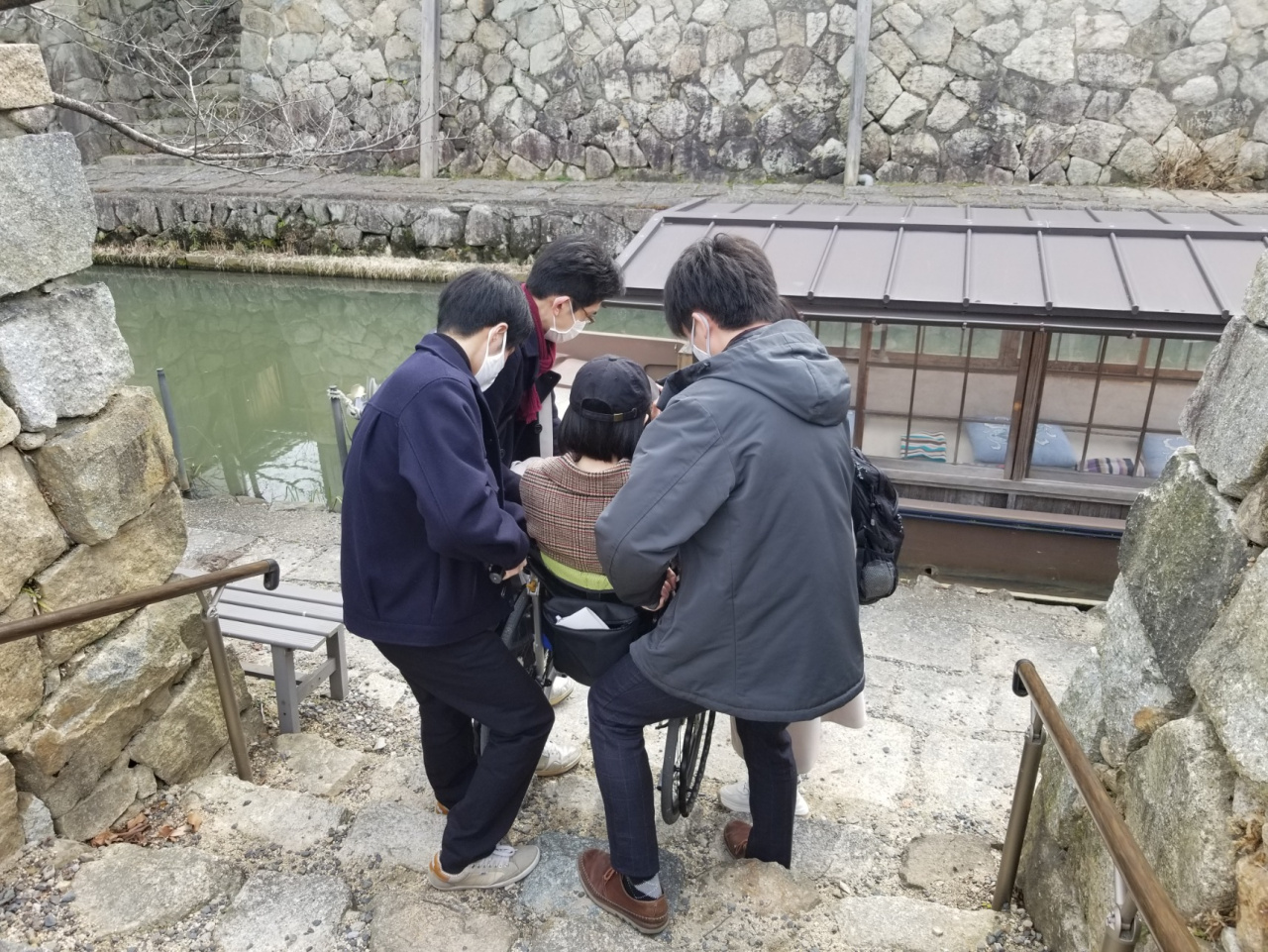 それまで、様々な準備を進めてきた受講生にとって、この決定は非常に残念なものになりましたが、宣言が解除された時のために、準備を進めたいとの強い思いから再度入念な下見をおこなうことにしました。受講生自らが車椅子に乗り、段差や階段の操作を体験し、トイレはバリアフリーなのか、手すりはどちらについているかなどの確認をしました。