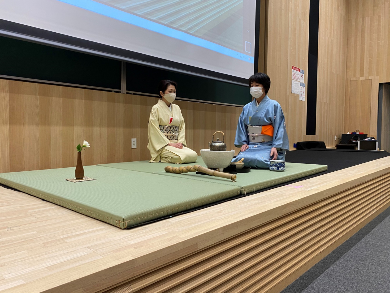 裏千家茶道教授 指心庵 米澤宗昭先生に「茶道から学ぶ気遣いの文化~短期大学部での学修を豊かにするために~」と題してご講演いただきました。春らしく美しい和菓子(ことの葉製)をいただき、盆点前の実演から茶道の精神にある気遣いと感謝、おもてなしの心をご教示いただきました。