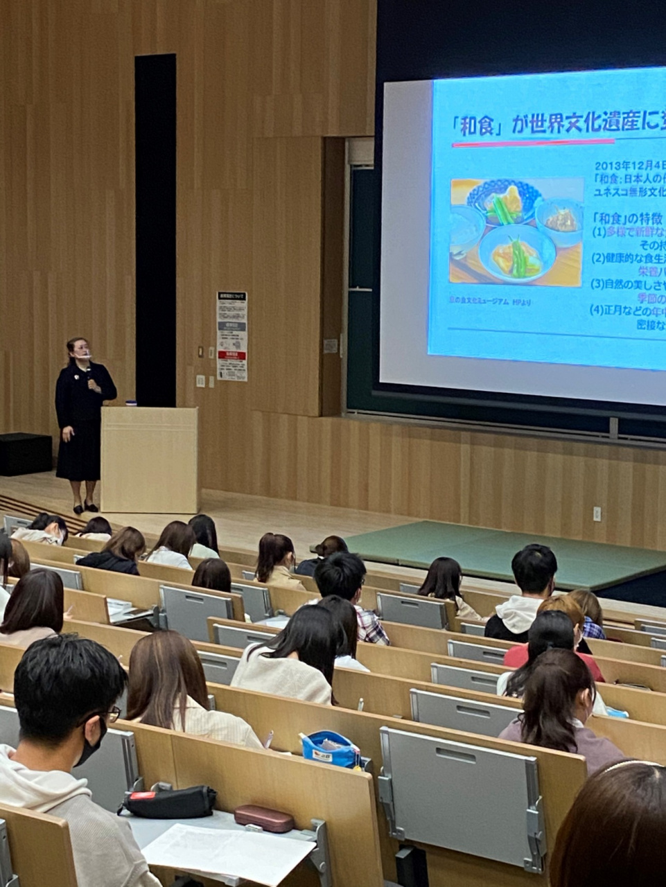 「食と生活」では、野口聡子准教授からいのち(身体と心)を健やかに保つ食事の大切さ、特に朝ごはんの重要性についてお話を聞きました。「いのちをいただく」という羽溪了教授のお話では、食べることは生きているものの<いのち>を頂戴することを学びました。また京都の食文化の特徴のひとつである「京の仕出し文化」を体験的に学ぶために、献立の解説を聞いたうえで、仕出し弁当(三友居製)を持ち帰りました。