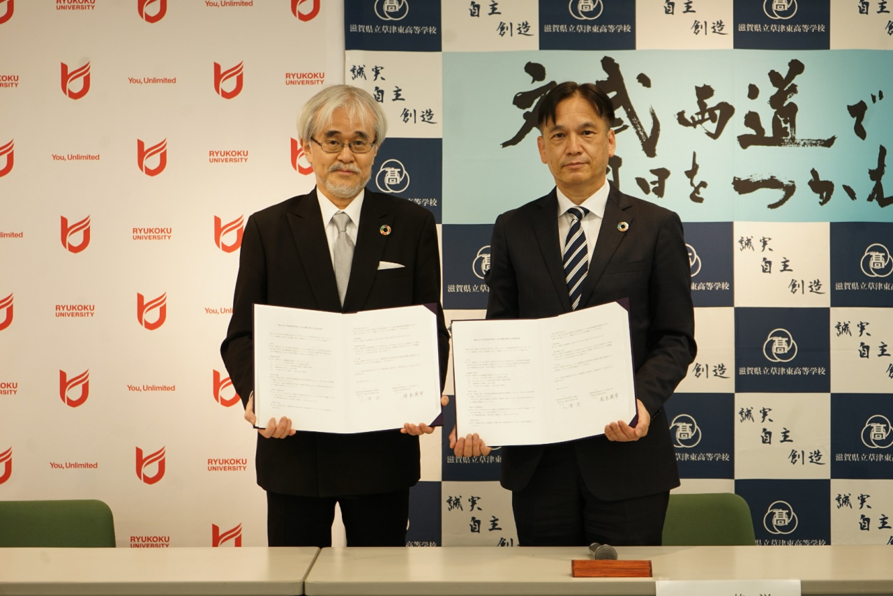 今回の協定は本学と草津東高校の双方が、教育・研究等のさまざまな分野において、人的交流および知的資源の相互活用その他の連携協力を推進することにより、それぞれの活動の充実・改善を図り、双方の教職員および学生・生徒の資質向上に努めることを目的とするものです。
