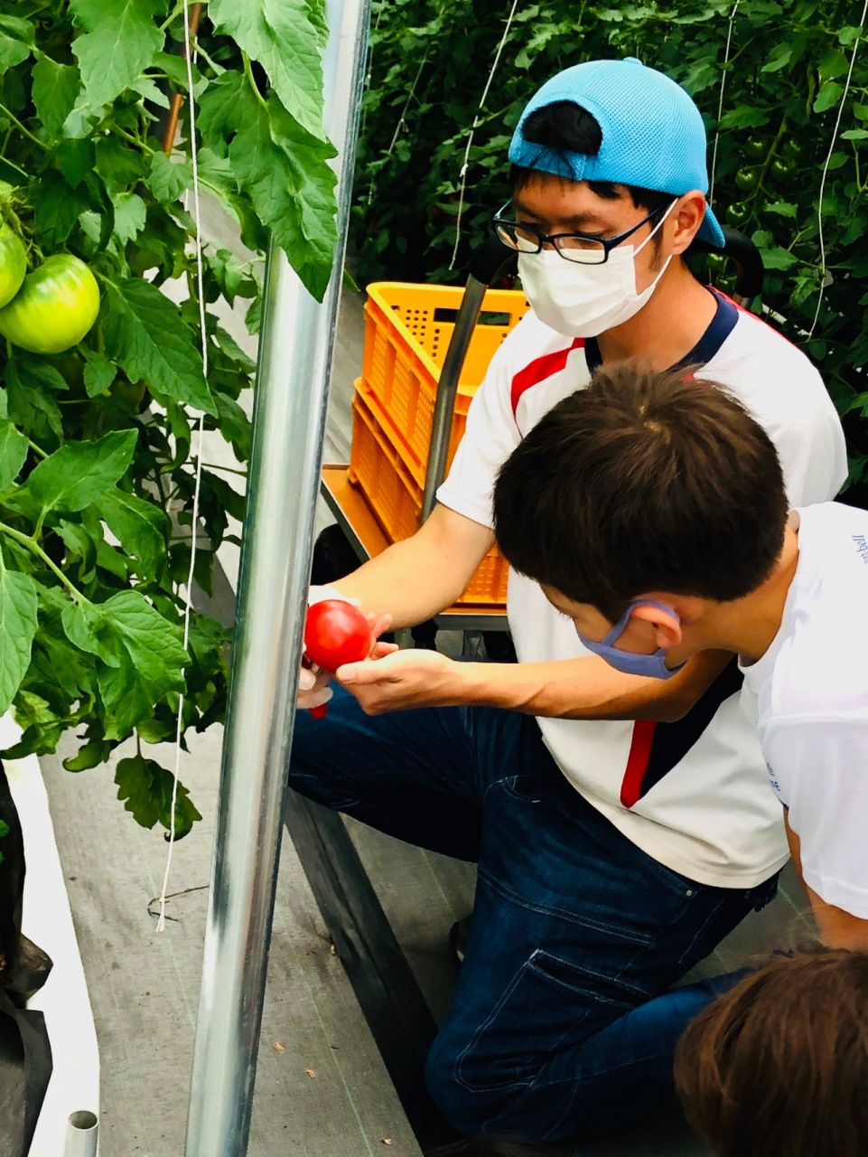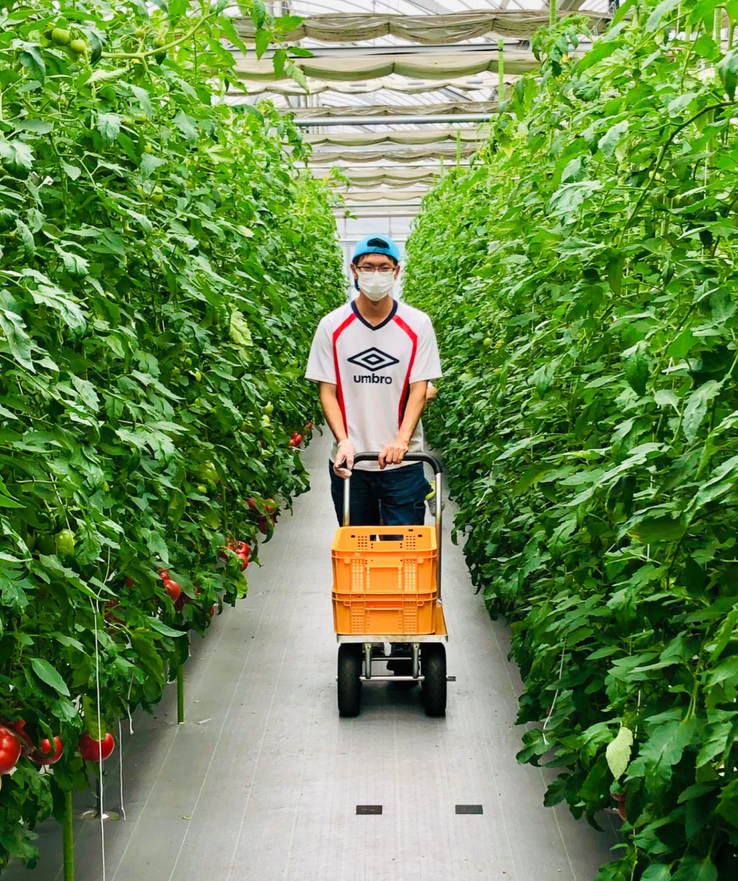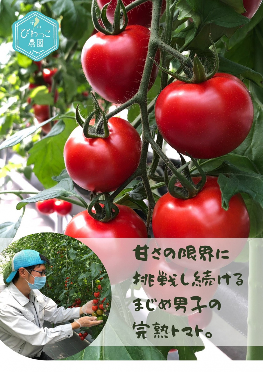 2020年3月に農学部資源生物科学科を卒業後、6月に守山市からの認定新規就農者として認められました。その後、起業するための準備をすすめ、2021年2月にトマトの栽培を開始しました。現在は、約2,000㎡のハウスの中で、1000㎡を使いトマトの栽培に充てています。トマトの品種は大玉トマトとミディトマト(中玉)の2種類で、合計2400本のトマトの栽培管理をしています。 収穫は、4月下旬から始まり、現在は、毎日約150㎏(約1500個)のトマトを収穫しています。採れたトマトはJAが運営するファーマーズマーケット「おうみんち」をはじめ、滋賀県内外のレストランにも卸しています。残りの1000㎡はイチゴを栽培する予定で、現在、「章姫」と「紅ほっぺ」の2品種を育苗中です。12月上旬には、約5000株のイチゴから真っ赤な実が収穫できる予定です。