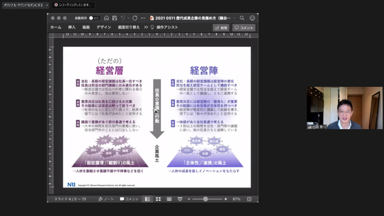 経営学部の専攻科目の一つである「株式会社論」では11日、野村総合研究所の上席コンサルタントである松田真一氏にご講演いただきました(オンラインでの開催です)。松田氏には『経営継承の鎖』日本経済新聞出版社、2018年のご著書があります。