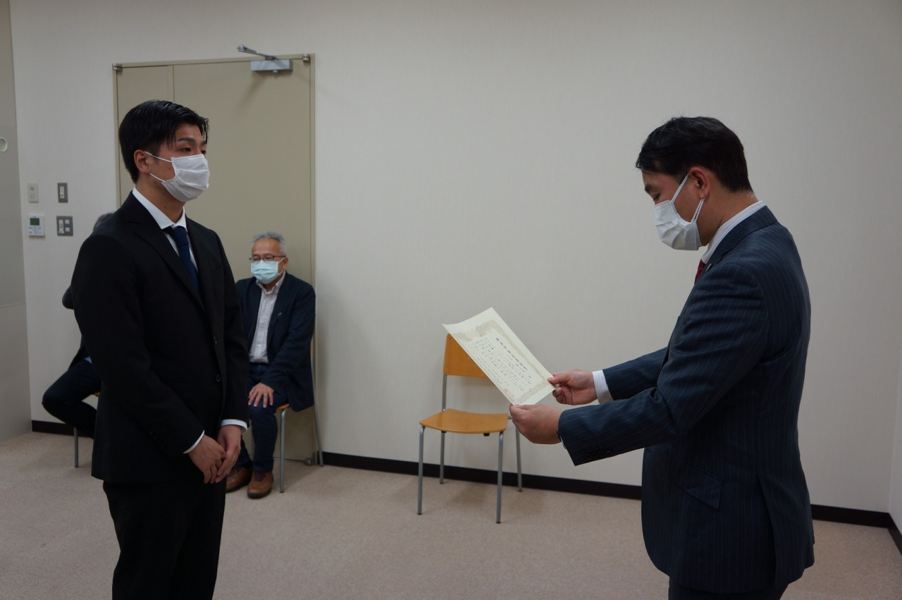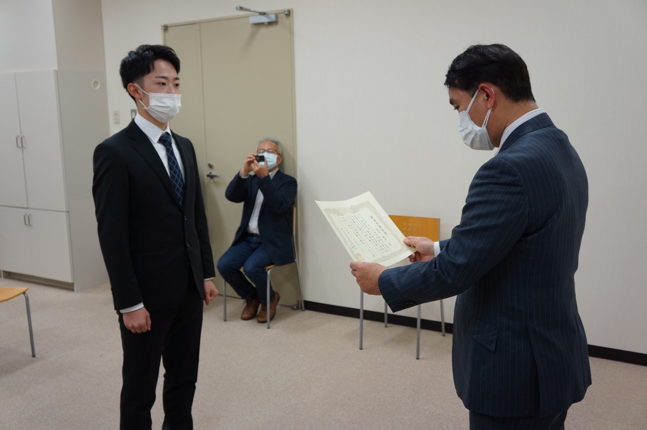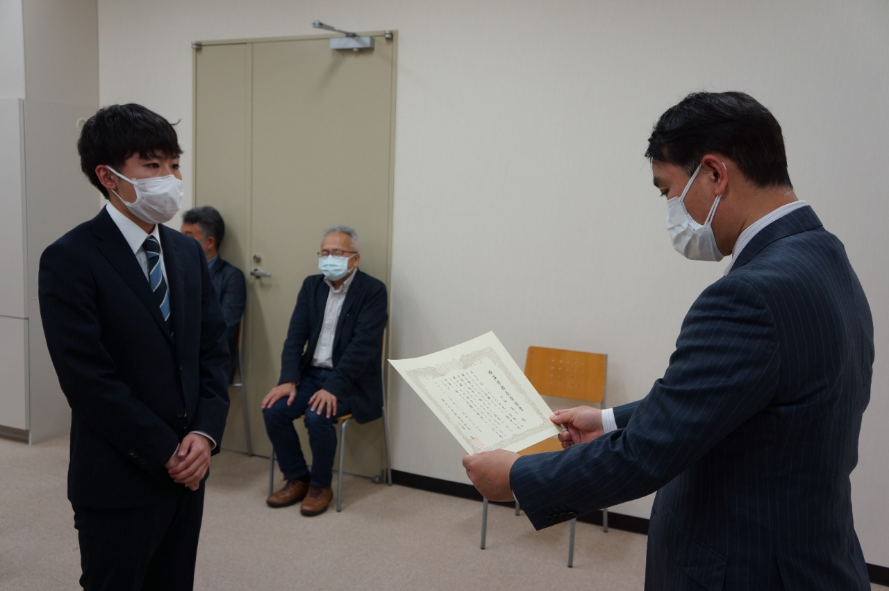 小峯 敦 経済学部長より賞状と記念品、経済学部同窓会からの副賞が贈呈された後、小峯学部長や蛭川教授、受賞者のゼミ担当である大原教授、原田教授、木下 信准教授(小峯学部長代読)よりお祝いと激励のメッセージが送られ、受賞者は、現状に甘んじることなく、さらに努力していくという決意を込めて、目を輝かせていました。