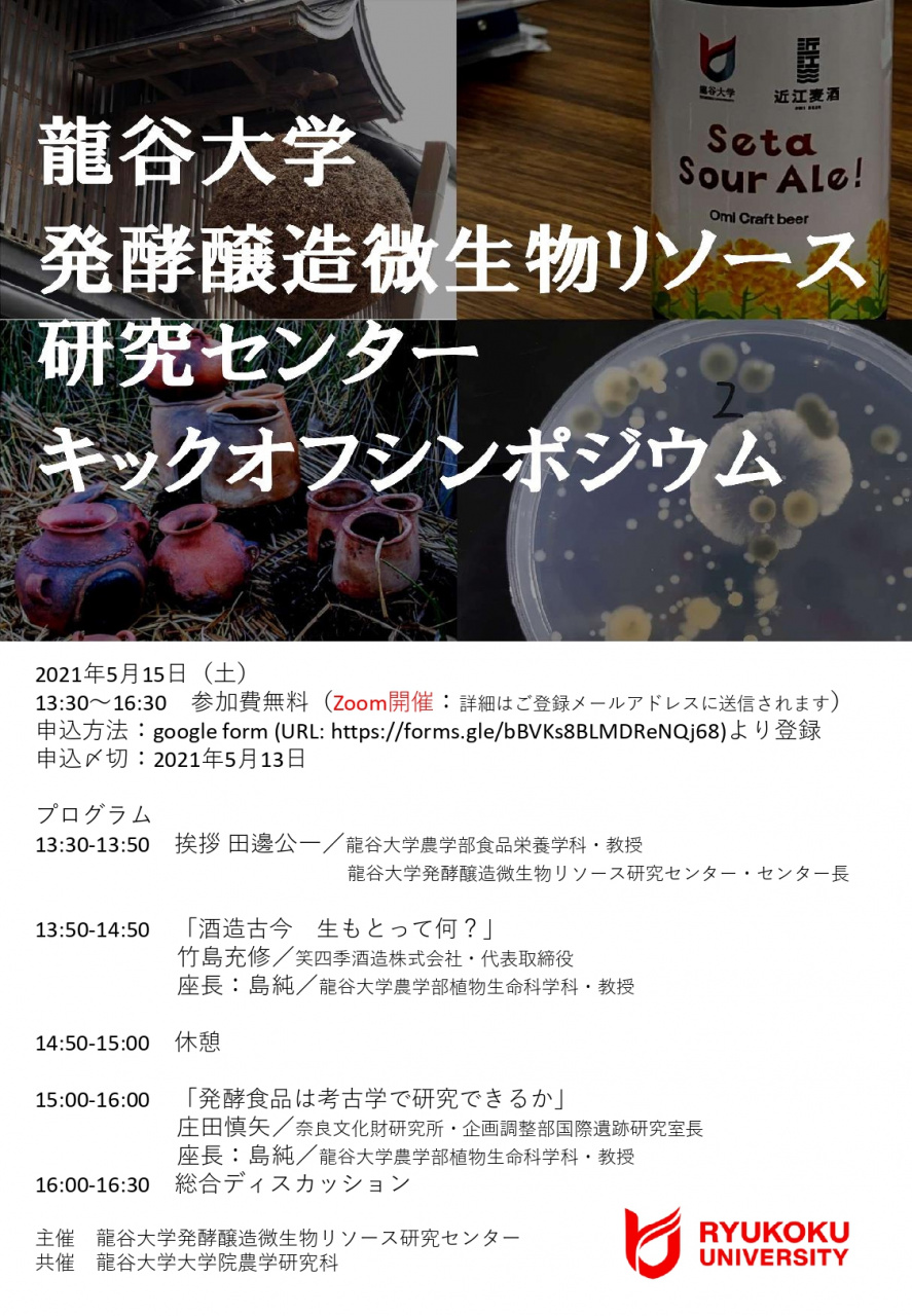 2021年5月15日、発酵醸造微生物リソース研究センターの発足を記念して、酒造および考古学の専門家をお招きし、オンラインによるキックオフシンポジウムを開催しました(共催:龍谷大学農学研究科)。学内外の研究者、市民や報道機関を含む70名以上の参加がありました。
