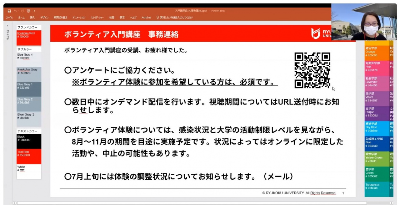 5/27に実施したオンライン講義では、そのうち43名がLIVEで参加しました。昨年度はセンター事業の紹介パートとボランティアの基礎的な事柄を学ぶパートを別々の日で設定しましたが、今回は一つにまとめて説明しました。