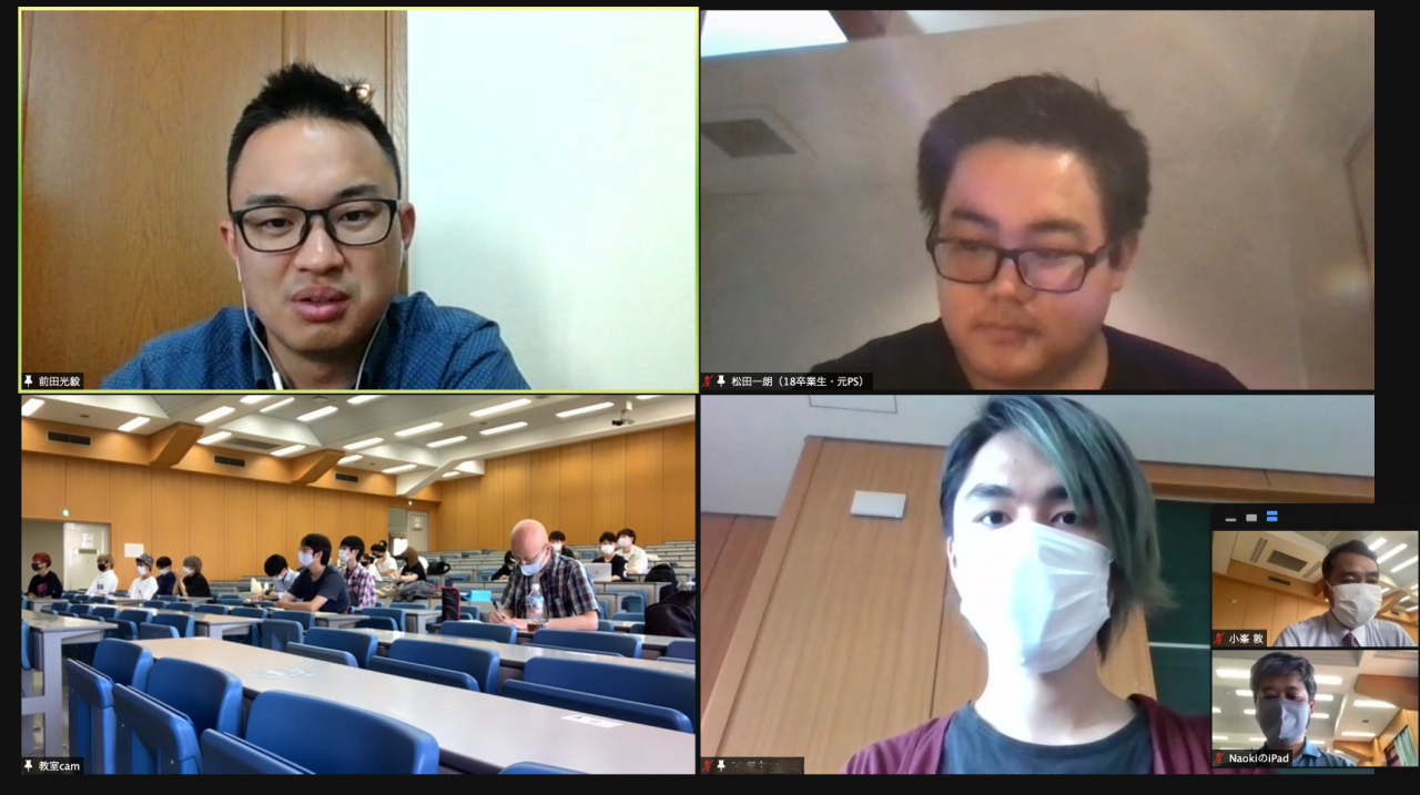 ここでハイフレックス型とは、対面で参加する教室の様子をライブ中継して、オンライン上からも自由に参加できる仕組みです。三密を避ける工夫と共に、遠隔から出演するメンターの便宜も図りました。