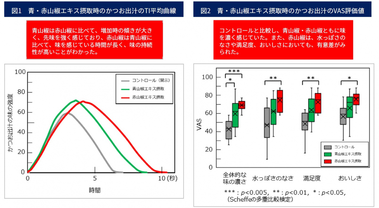 検証は、大学生(20代)9名を対象として官能評価を実施しました。青山椒/赤山椒のエキスを配合した烏龍茶を試飲後、塩分濃度が低いかつお出汁(塩分0.4%)を飲み、TI(※1)法 およびVAS(※2)法を用いて、かつお出汁について評価をしました。その後、青山椒・赤山椒のエキスについて、LCMS(※3)を用いた網羅的解析を行い、赤山椒に特徴的に多い成分をいくつか抽出し、効果を有する画分を絞り込みました。