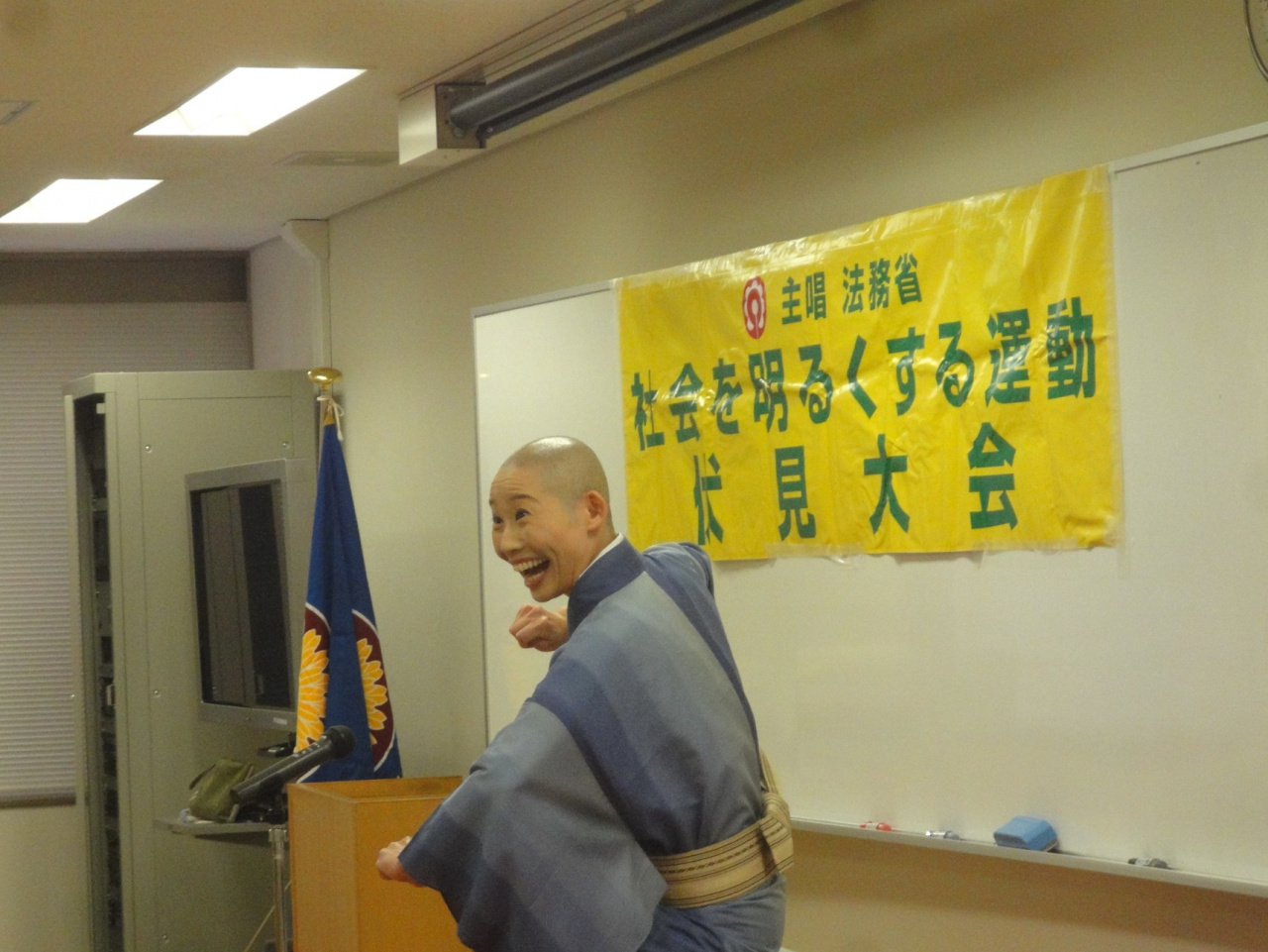 当日は、浜井浩一矯正・保護総合センター長(本学法学部教授)が式典から出席しました。第1部の講演会では、「おはなはんと再犯防止」と題し、石塚伸一龍谷大学犯罪学研究センター長(本学法学部教授・矯正・保護総合センター兼任研究員)が講演しました。その後、前回に引き続き、本学公認サークル「深草BBS会」の学生より、自分たちがおこなっているボランティア活動(「放課後学び教室」等)について紹介がなされました。第2部では、露の団姫氏が、古典落語の演目「お血脈(おけちみゃく)」を演じ、場内を沸かせました。大会は盛会のうちに終了しました。