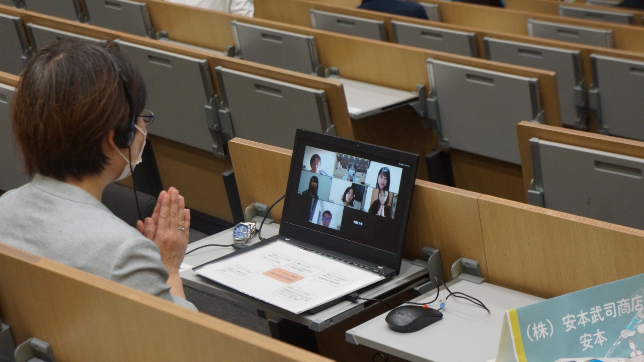 3,4年生約140人は20チーム(うち3チームがオンライン)に分かれ、1チーム1社の担当者と25分程度懇談する形式を採り、各チームとも3社と交流しました。