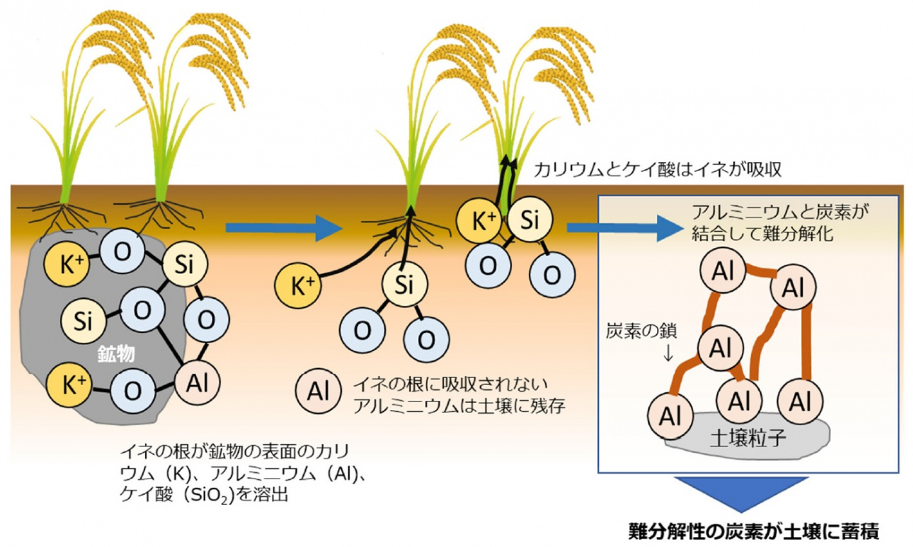 - 土壌中の鉱物はカリウム、ケイ酸に加えてアルミニウムを含むため、イネが鉱物を壊してカリウムとケイ酸を吸収すると、アルミニウムが土壌に残ります。土壌中ではアルミニウムは炭素と速やかに結合し、難分解性炭素を形成します。多収イネ栽培水田の土壌には、このようなメカニズムで難分解性炭素が蓄積したと考えられました(図1、図2)。他方、コシヒカリは、鉱物由来のカリウムを利用しなかったため、難分解性炭素が蓄積しなかったと推定されました。