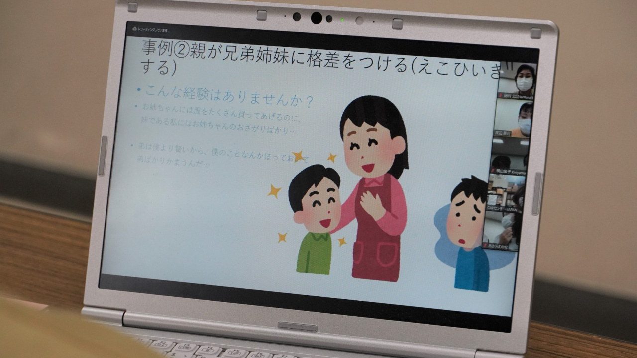 例を挙げると「親が兄弟姉妹で格差をつける(えこひいきをする)」のは違反しているかどうかなどです。実際のアンケート結果もすぐに報告しながら、権利内容と事例を照らし合わせて紹介していきました。