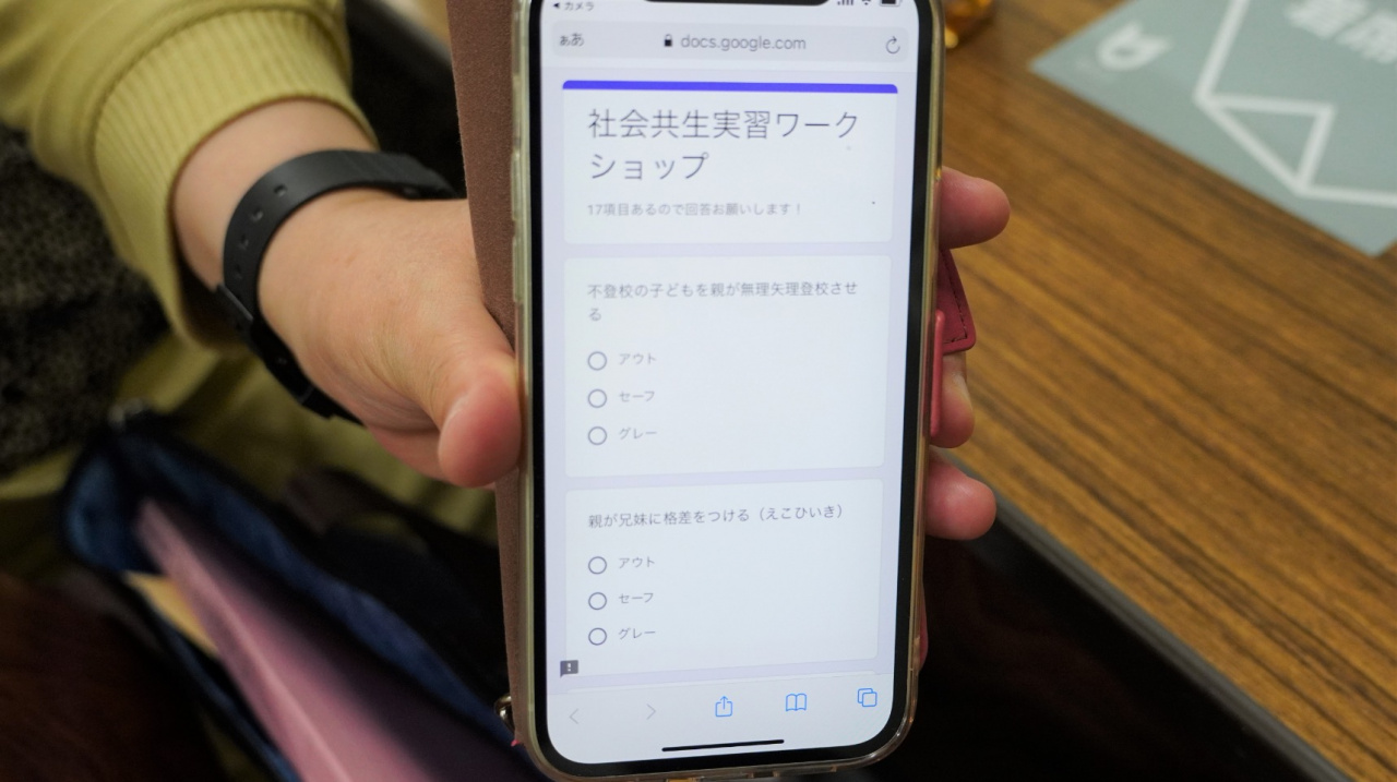 まず初めに、スライドを用いて「子どもの権利」についての説明をし、幾つかの事例について、権利に違反しているかどうかの分類をその場でオンラインアンケートを用いておこなってもらいました。
