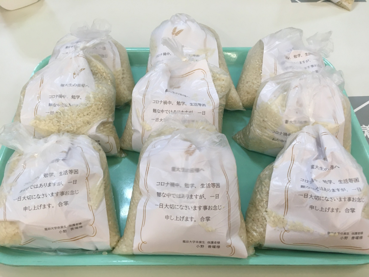 7月6日に、メッセージカードを添えて、保護者の方の想いと共に学生に配付させていただきました。