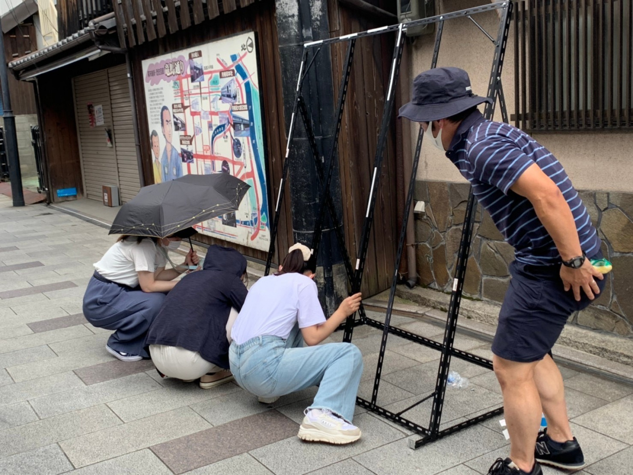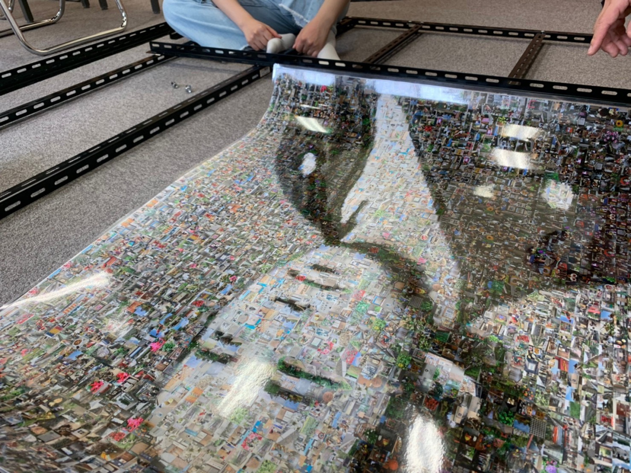 竜馬通り商店街にてモザイクアートの設置を終え、伏見桃山への愛に包まれたかっこいい坂本龍馬が浮かび上がりました。この龍馬は7月25日から8月9日まで展示を行っています。展示直後から、ご覧になった方の「すごい」との声も聞こえ、設置作業に関わった学生も喜んでいます。今後も、たくさんの方々に見ていただき、伏見桃山の魅力を知っていただければと考えています。