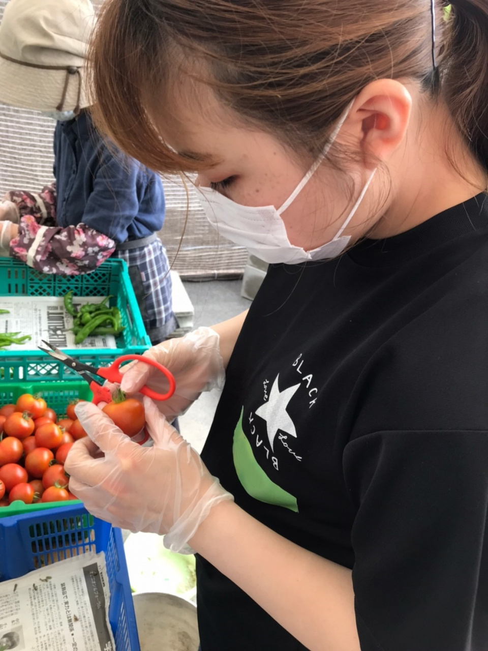 出荷作業では、利用者さんと一緒にトマトのパック詰めと玉ねぎの根葉切り作業を行いました。どちらも利用者さんやスタッフさんに方法を教わりながら、1つ1つ丁寧に作業をしました。トマトのパック詰めは、トマトの表面をウェットティッシュで拭いて汚れを落としてから、ビニール袋に詰める作業です。農薬を使わない「おもや」の農産物には病害虫がつきやすい一方、直接販売するものが多いので、病気や虫にやられた実を除き、汚れを落とさないと消費者の方々に喜んで買ってもらえなくなります。
