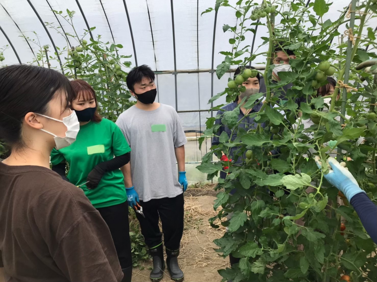 現場初日の作業では、トマトの下葉切りとイチジクの木の害虫の駆除を行いました。トマトは下葉切り(古い下葉)を切ることにより、風通しが良くなり、病気や害虫被害の防止にもなる他、葉全体に日が当たりやすくなるため、甘くて色づきの良い実がなるそうです。また、イチジクの木は害虫被害を最小限に抑えるため、害虫が卵から孵化する前に虫網で丁寧に取り、駆除をするそうです。私たち実習生もトマトやイチジクを食べさせていただきましたがとても美味しかったです。
