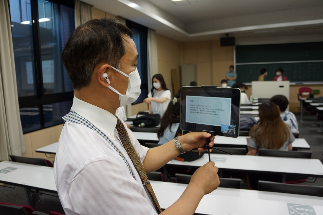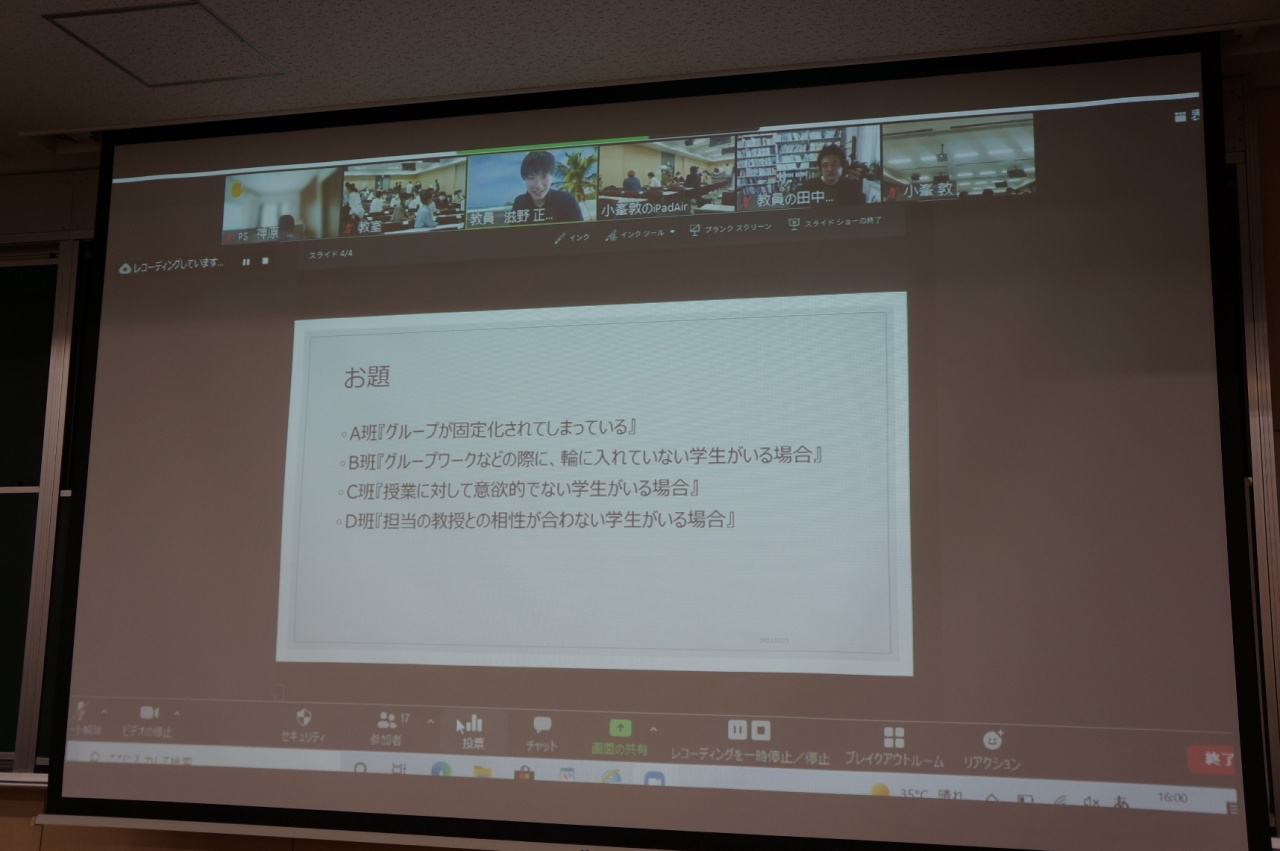経済学部では、「授業内ピア・サポーター(PS)」制度を確立し、定期的に研修を行っています。入門演習の最終日を機に、1年生の見学会を兼ねて、ハイフレックス型の研修を実施しました。(ここでいうハイフレックス型とは、対面で参加する教室の様子をライブ中継して、オンライン上からも自由に参加できる仕組みです。)