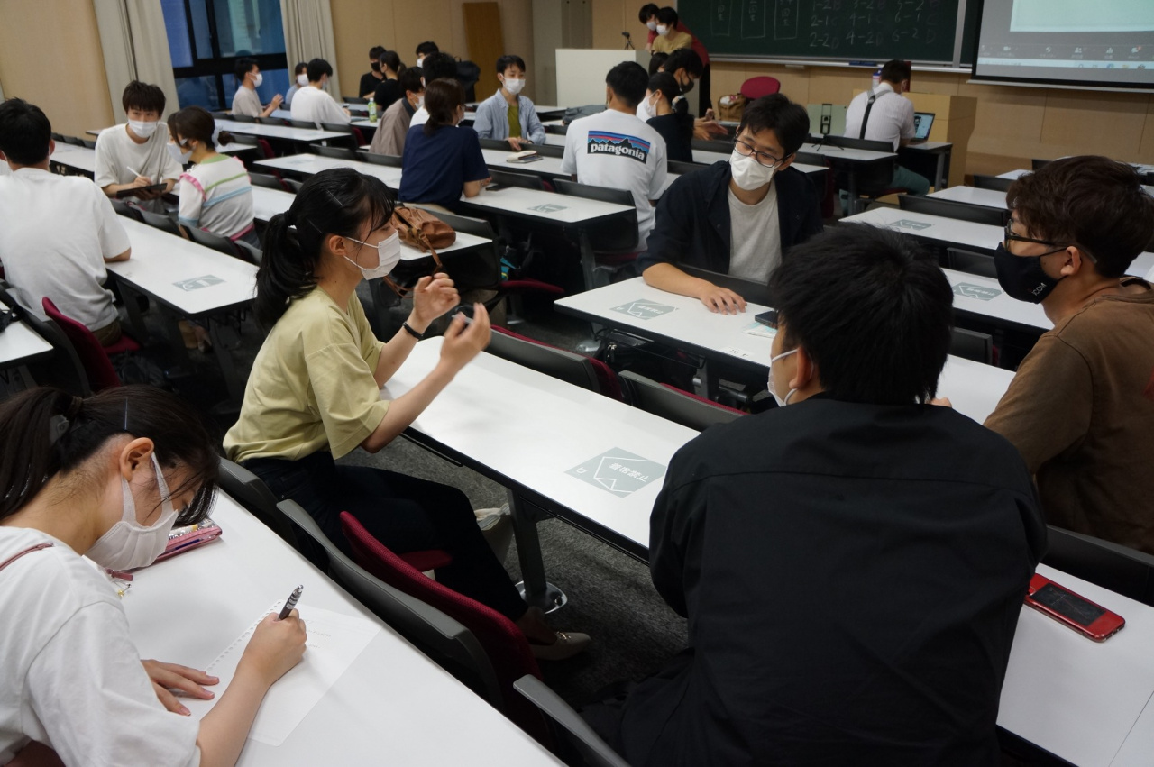 三密を避ける工夫と共に、遠隔からアクセスする1年生や上級生の便宜も図りました。なお、教室内では学生同士の発話は最小限に抑え、ソーシャルディスタンスを保った配置にしました(座った席をmanabaに記録してあります)。