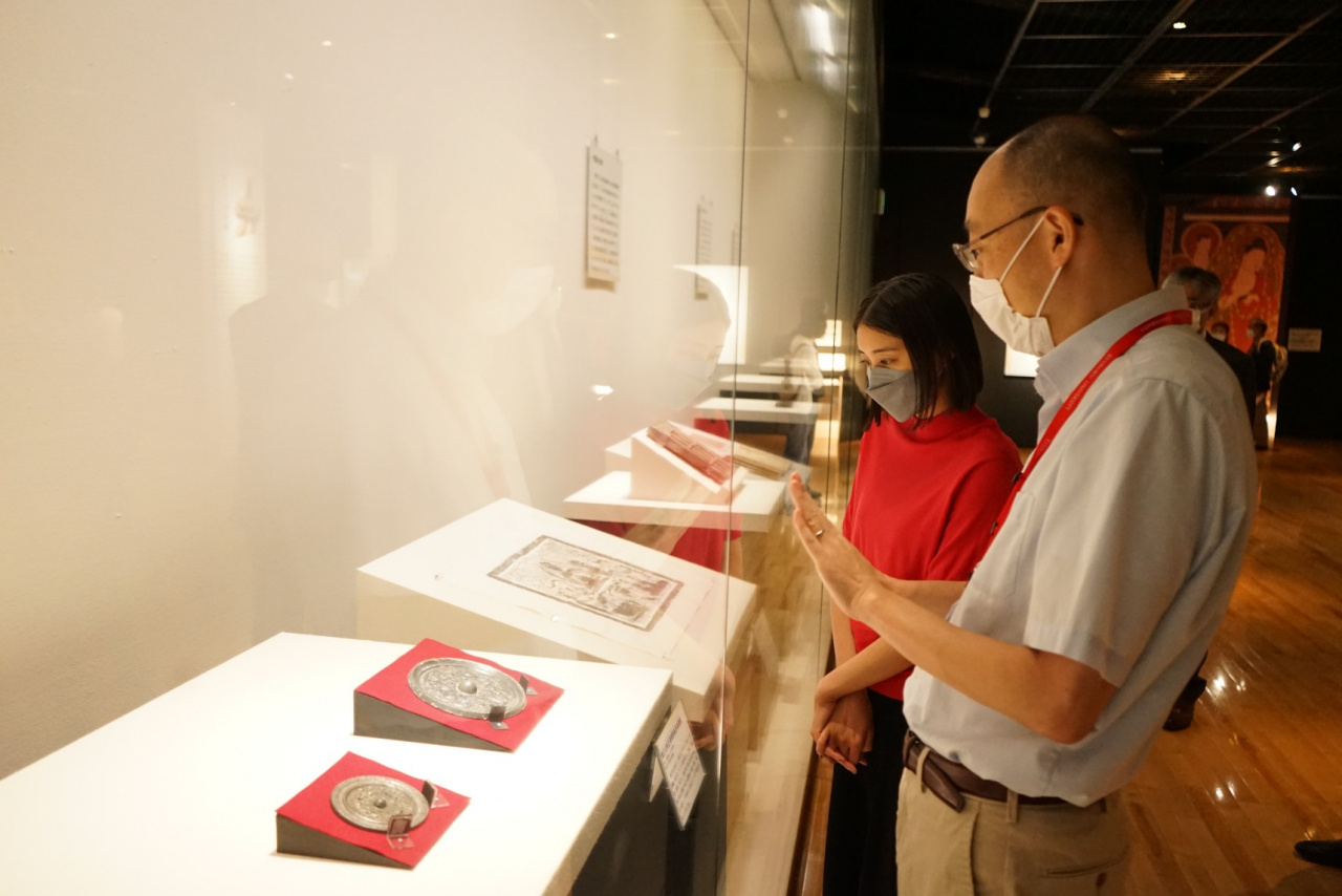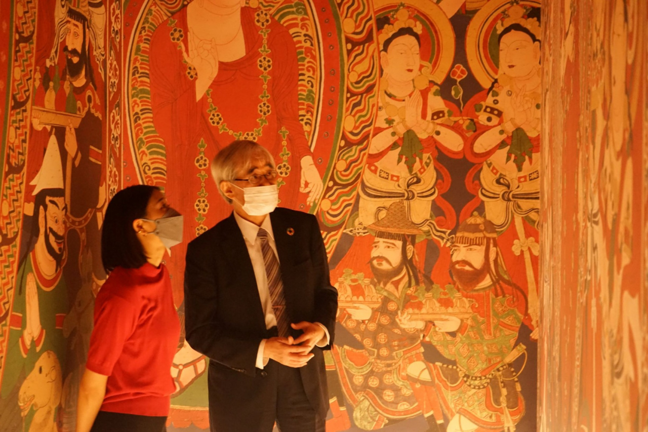 トークセッションに先立ち、和田さんは現在開催している秋季特別展「アジアの女神たち」を岩井龍谷ミュージアム学芸員の解説のもと観覧され、終始熱心に質問をされるなど、仏教や仏像についての関心の高さがうかがえました。また、ベゼクリク石窟大回廊復元展示を観覧された際には入澤学長が解説し、龍谷ミュージアムの展示全体をお楽しみいただけました。