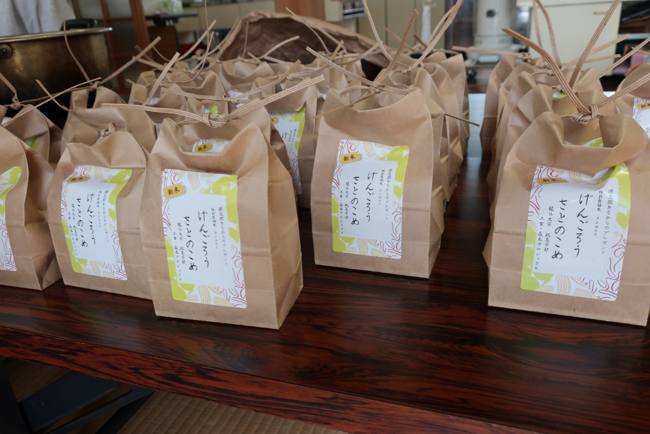 ■経済班は、11月24日(水)に予定している京阪「龍谷大前深草」駅マルシェの取組に向け、「ゲンゴロウ郷の米」2合パックの準備作業を実施しました。今年の「ゲンゴロウ郷の米」の学内販売から、従来から提供いただいている京丹後森本アグリ株式会社以外に、同じ農法を遵守して生産している「小町の里生産組合」の米も取り扱っています。駅マルシェの小さな袋も同じように、両団体の「ゲンゴロウ郷の米」を学生・生産者とで慎重に計測しながら封入しました。尚、この2合パックのパッケージデザインは、今回の駅マルシェ限定です。