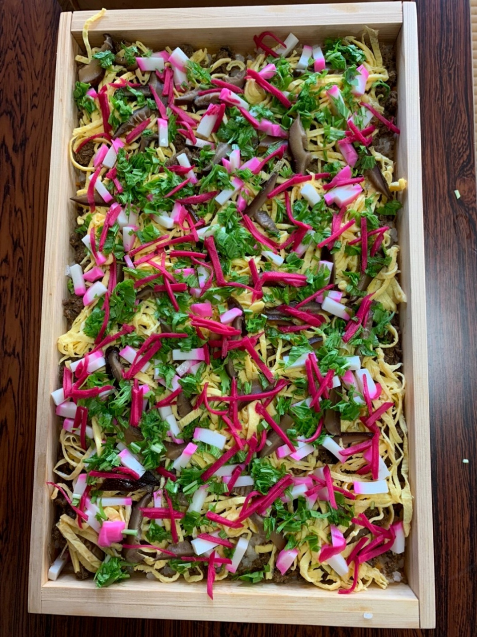 まんぐるわ三重・森本(女性だけの野菜・加工グループ)の皆さんから、冠婚葬祭で提供される郷土料理「丹後バラ寿司」をふるまっていただきました。本来であれば一緒に調理をしたいところですが、日帰りフィールドワークでは十分な時間も取れず、またコロナ感染対策上も難しいため、調理工程は市民局の方に動画撮影していただき、最後の盛り付け工程のみ実演いただきました。学生たちはランチとして美味しく実食体験しました。今回の体験をもとに、各自宅でレシピと動画を確認しながら家族と共に作ってみよう、ということになりました。