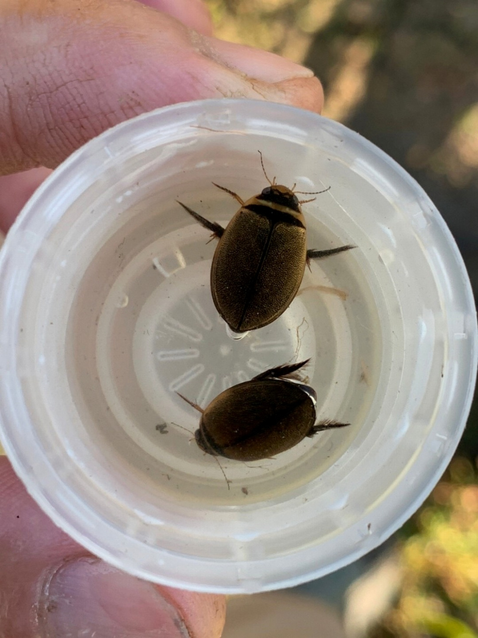 ■政策班は、谷垣先生とともに、京丹後森本アグリ株式会社と小町の里生産組合が管理しているゲンゴロウ水田で生き物調査を実施しました。この水田は、本プロジェクトが地域ブランド化しようとしている「ゲンゴロウ郷の米」が生産されている水田です。収穫後も生物の棲み処として水を残している「ひよせ」に生き物たちが生存しているかどうかを定期的に調査しています。学内でも販売している「ゲンゴロウ郷の米」は、この生物調査も農法の条件に入れています。今回の調査でも「マルガタゲンゴロウ」の他、多様な生き物を確認できました。