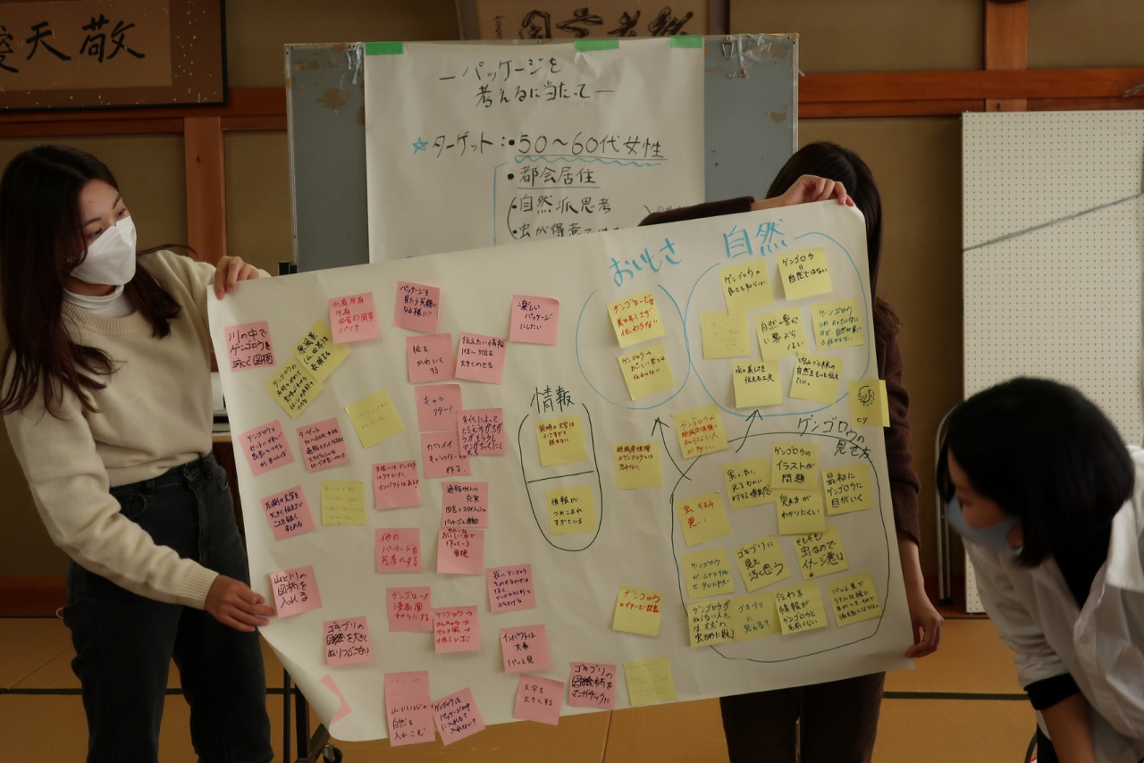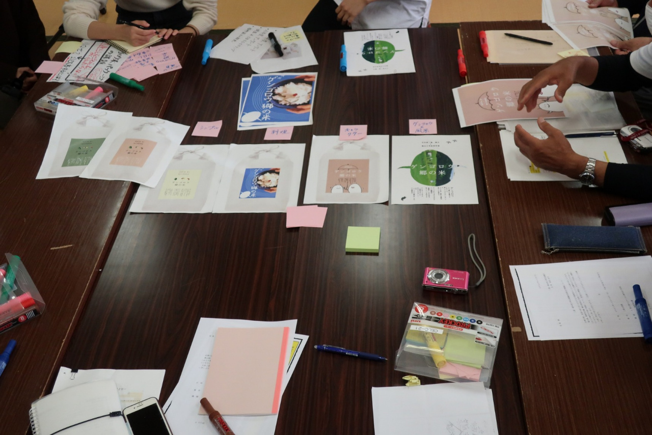 ■広報班は、「ゲンゴロウ郷の米」の新しいパッケージデザインを考えるワークショップを地域の皆さんと実施しました。これまでのパッケージに対する消費者の意見を参考にしながらターゲット層を明確にし、伝えたいメッセージを整理した後、学生が考えた4つの原案を提示しながら地域の方々の意見を伺いました。今後、学生側でさらにデザインを絞りこんで、都会の消費者層へのテストなどを通して来年の新米販売までに完成予定です。