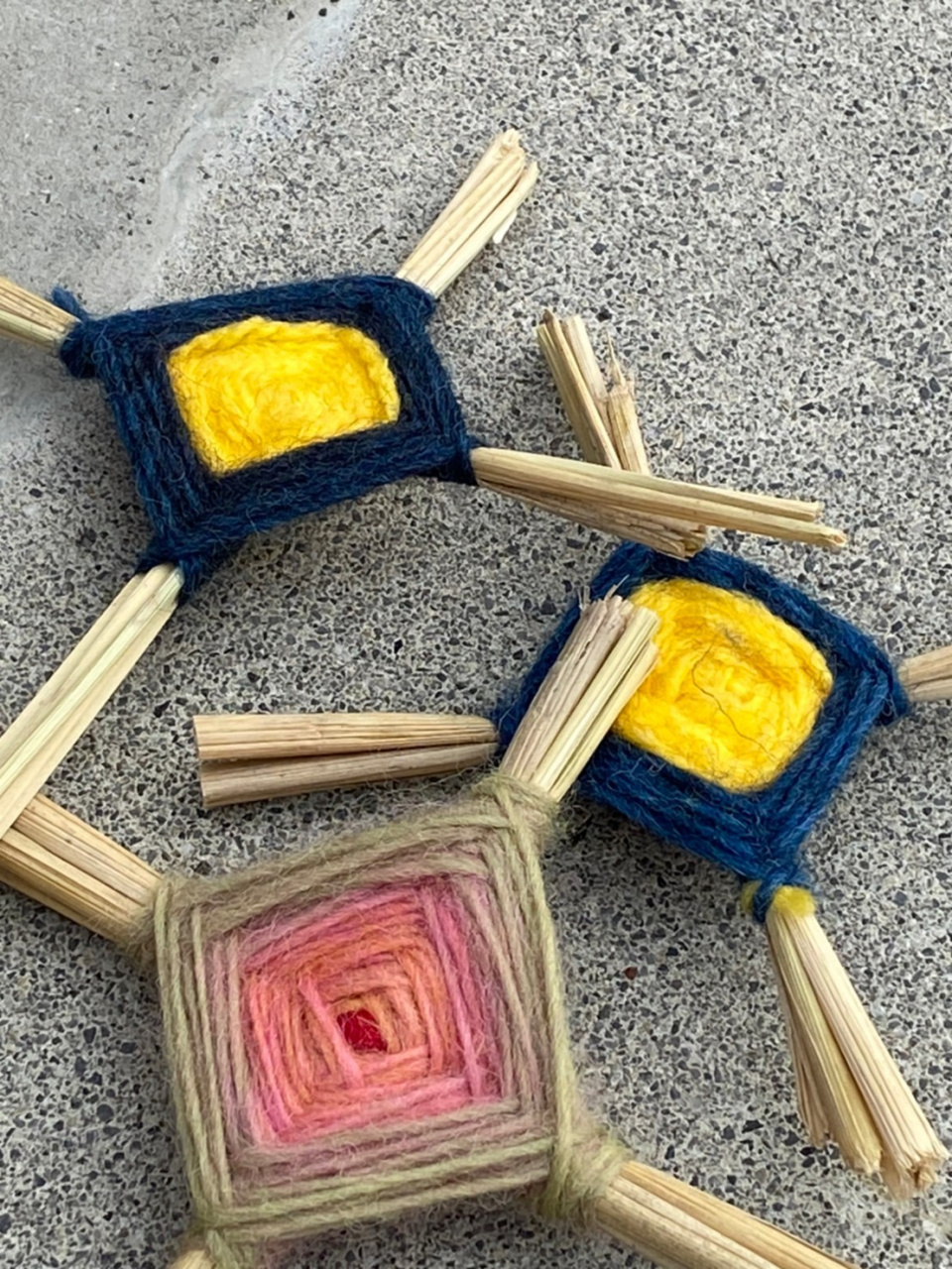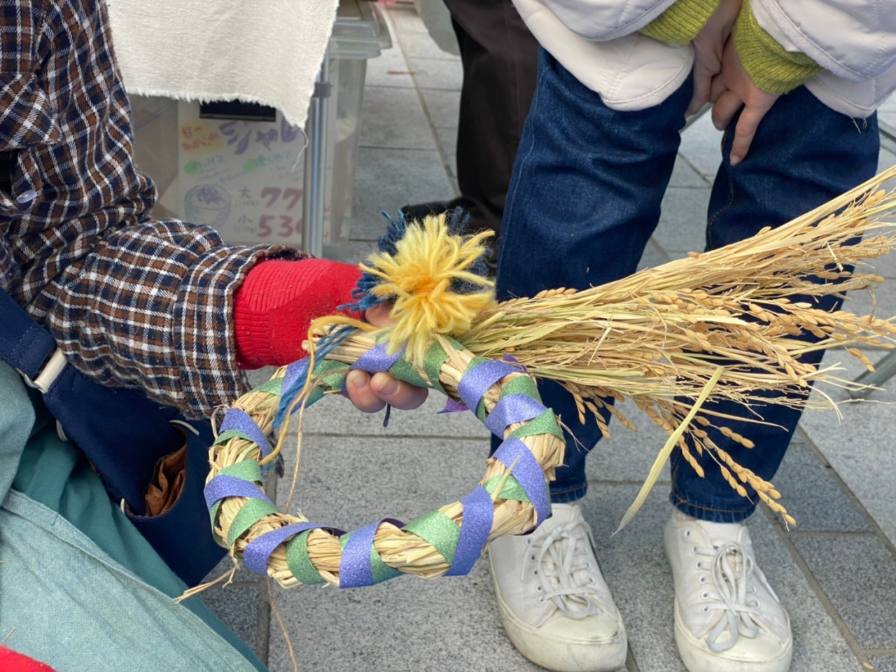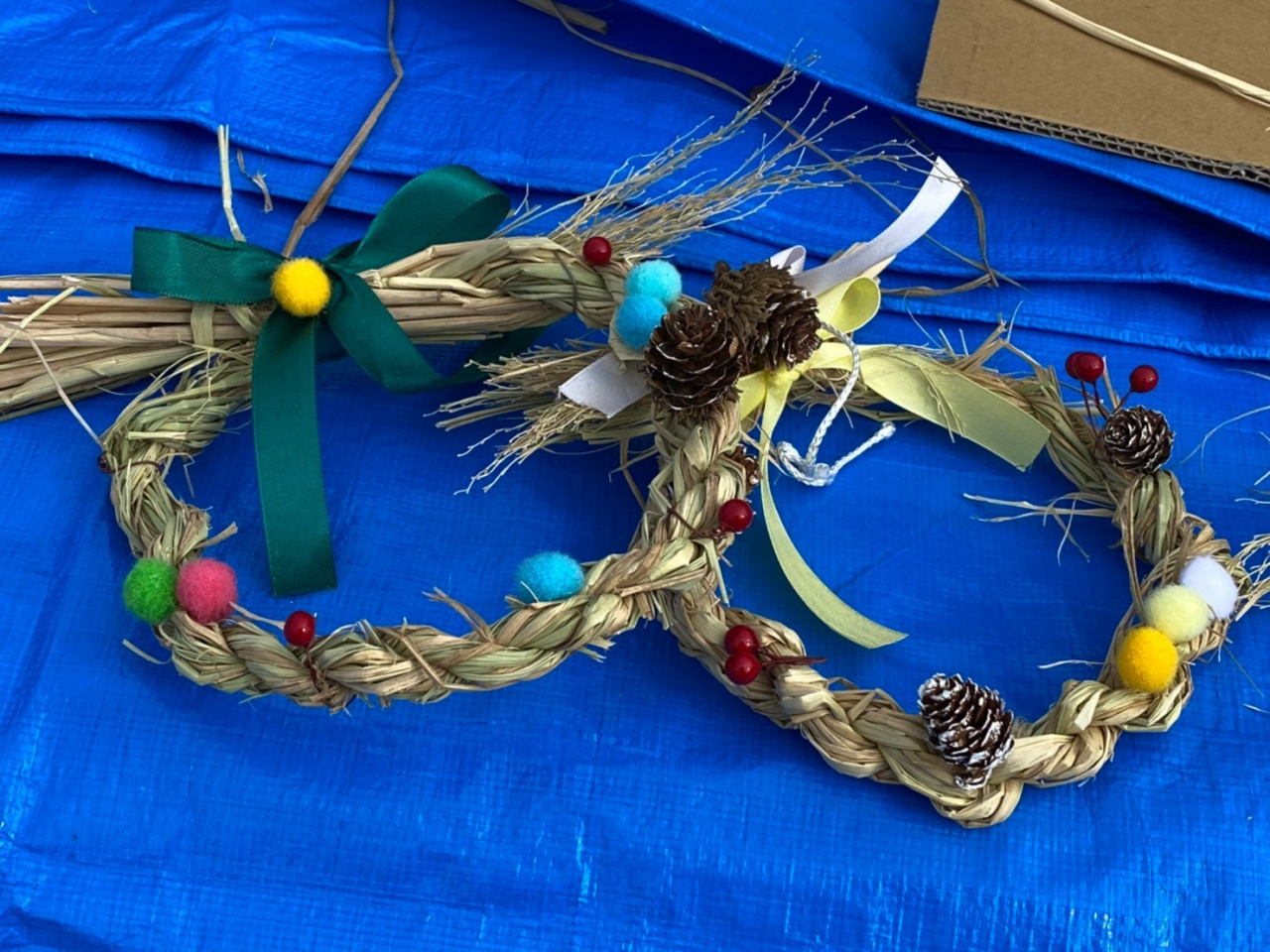 今回は「おもや」さんの田んぼで収穫された稲わらを使用してリースと十字の形をしたアクセサリーを作るワークショップを、おもやさんが参加するくさつFarmers’ Marketで開催し、訪れる方々には自由に飾りつけをして楽しんでもらいました。