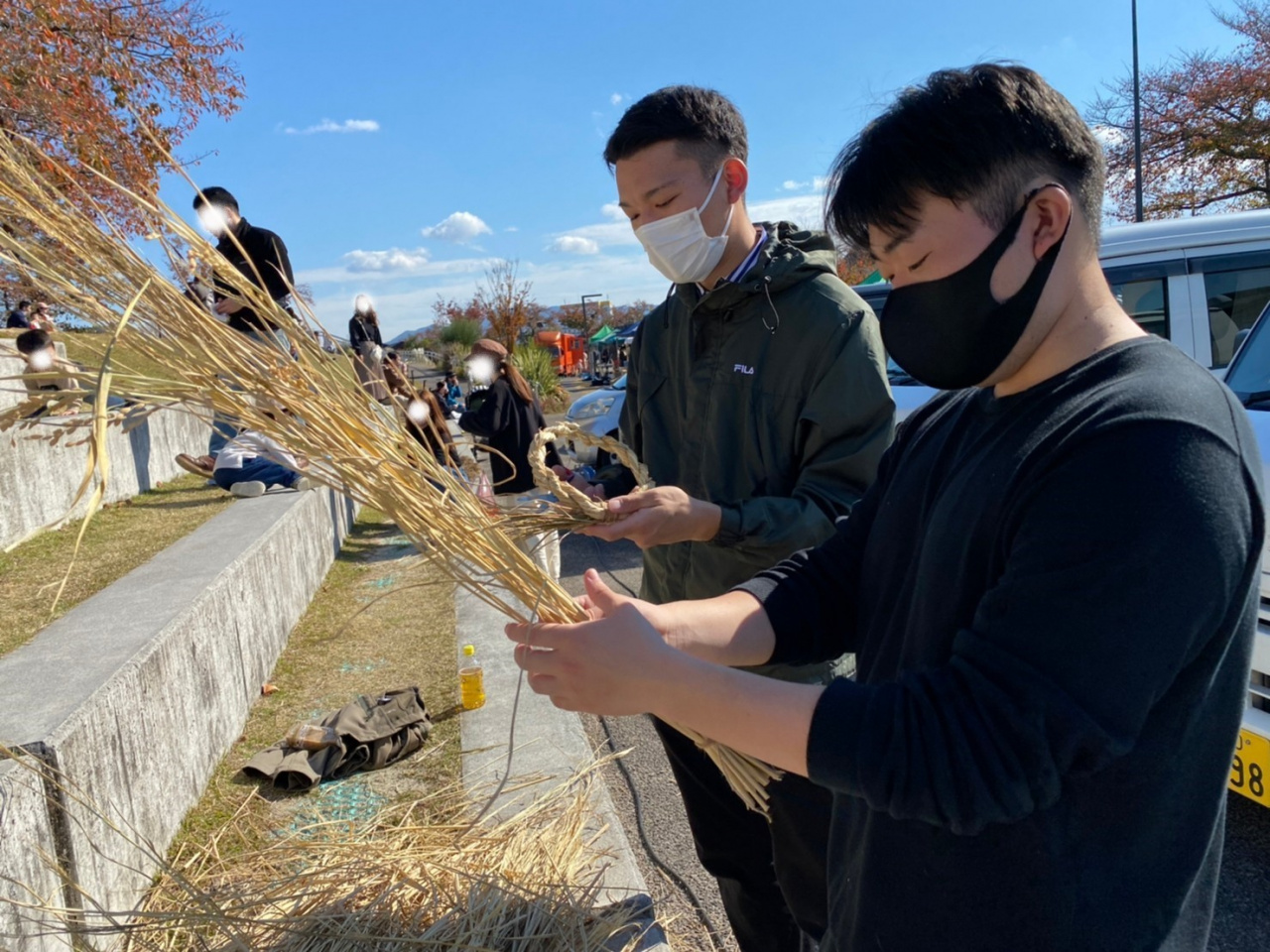 「社会共生実習(農福連携で地域をつなぐー「地域で誰もがいきいきと暮らせる共生社会に向けて」)」(担当教員:コミュニティマネジメント学科 坂本清彦)では11月14日(日)に草津川跡地公園de愛ひろばで開催されたくさつFarmers’ Marketにて、しめ縄リースづくりのワークショップをおこないました。