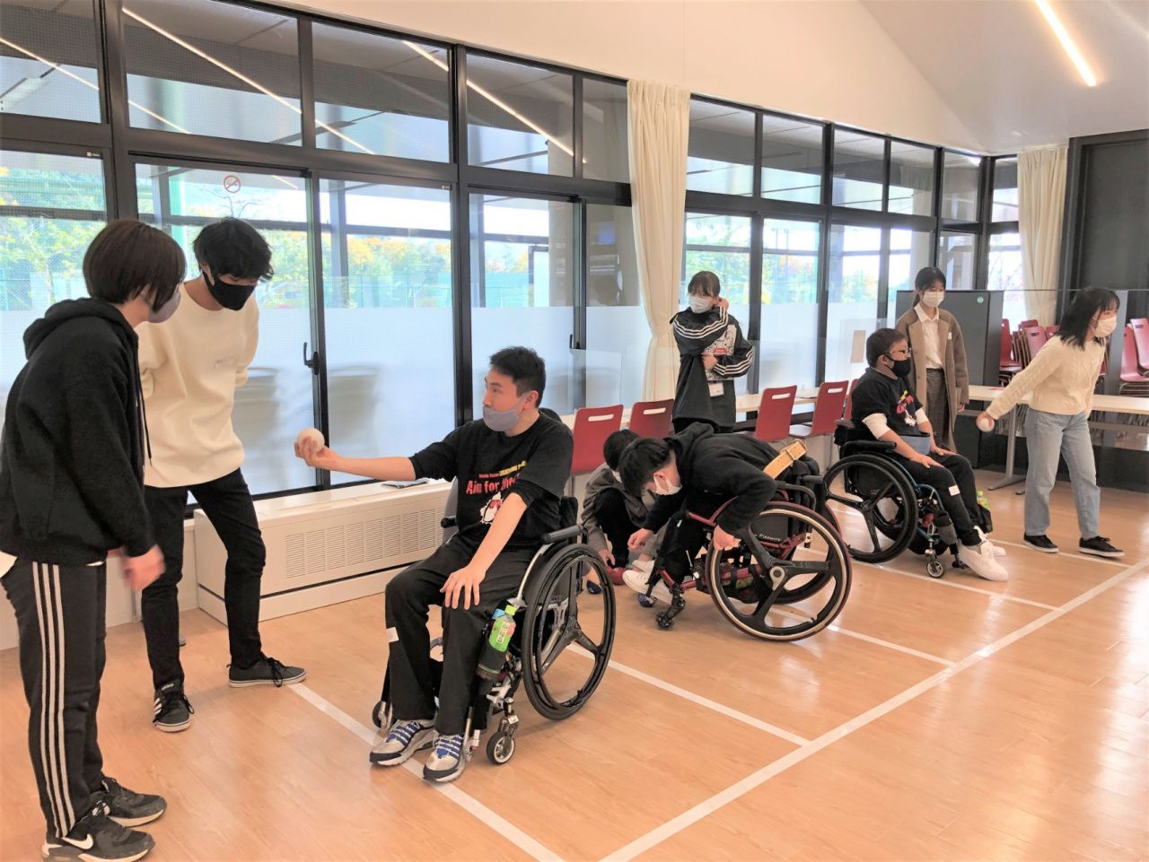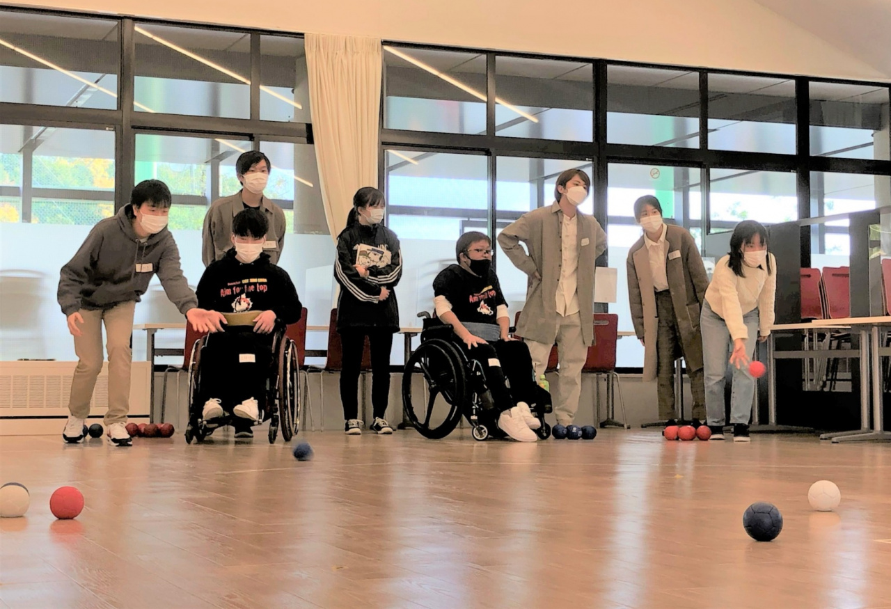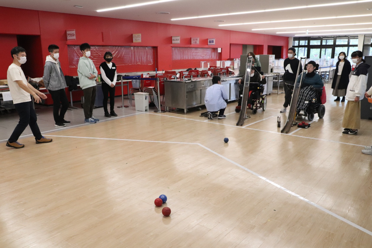 一面は実際にボールを投げてみるコートとして使用し、選手のみなさんから投球する際に狙うところなどのアドバイスや、絶妙な投球コースを見せていただきました。学生たちは、初めて体験するボッチャの投球に一喜一憂していました。