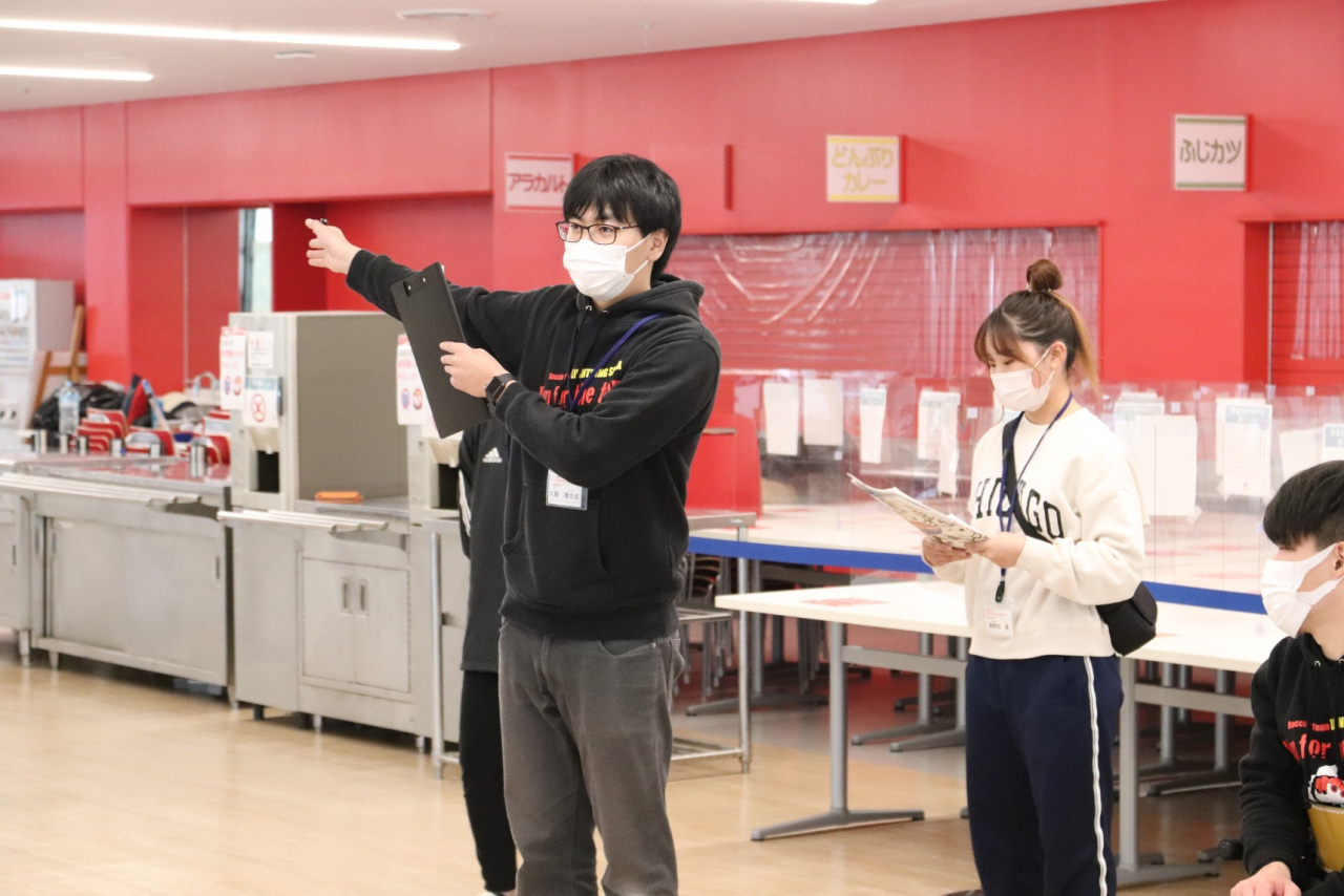 普段は食堂として使われているスペースの椅子や机を片付けて、室内競技用のラインテープを貼って体験用のコートを2面準備しました。