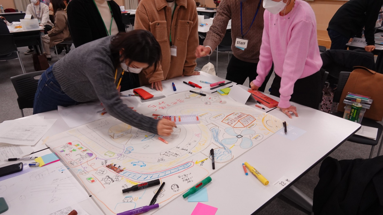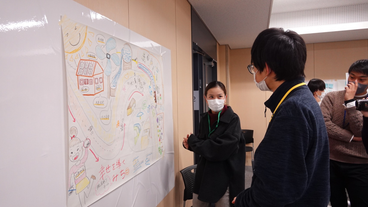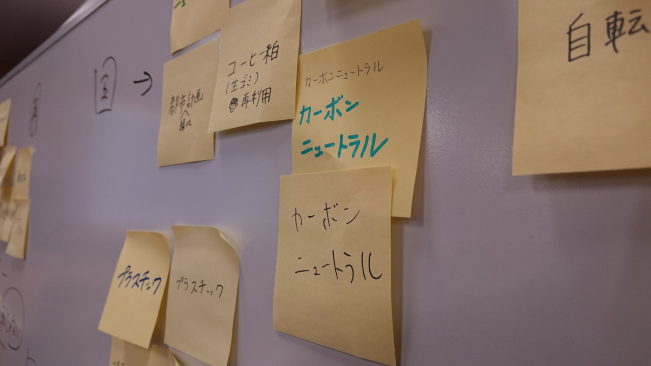1日目の成果物として、10年後をイメージした「脱炭素社会の姿」が各班の大きな模造紙に描かれました。