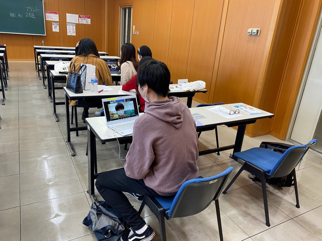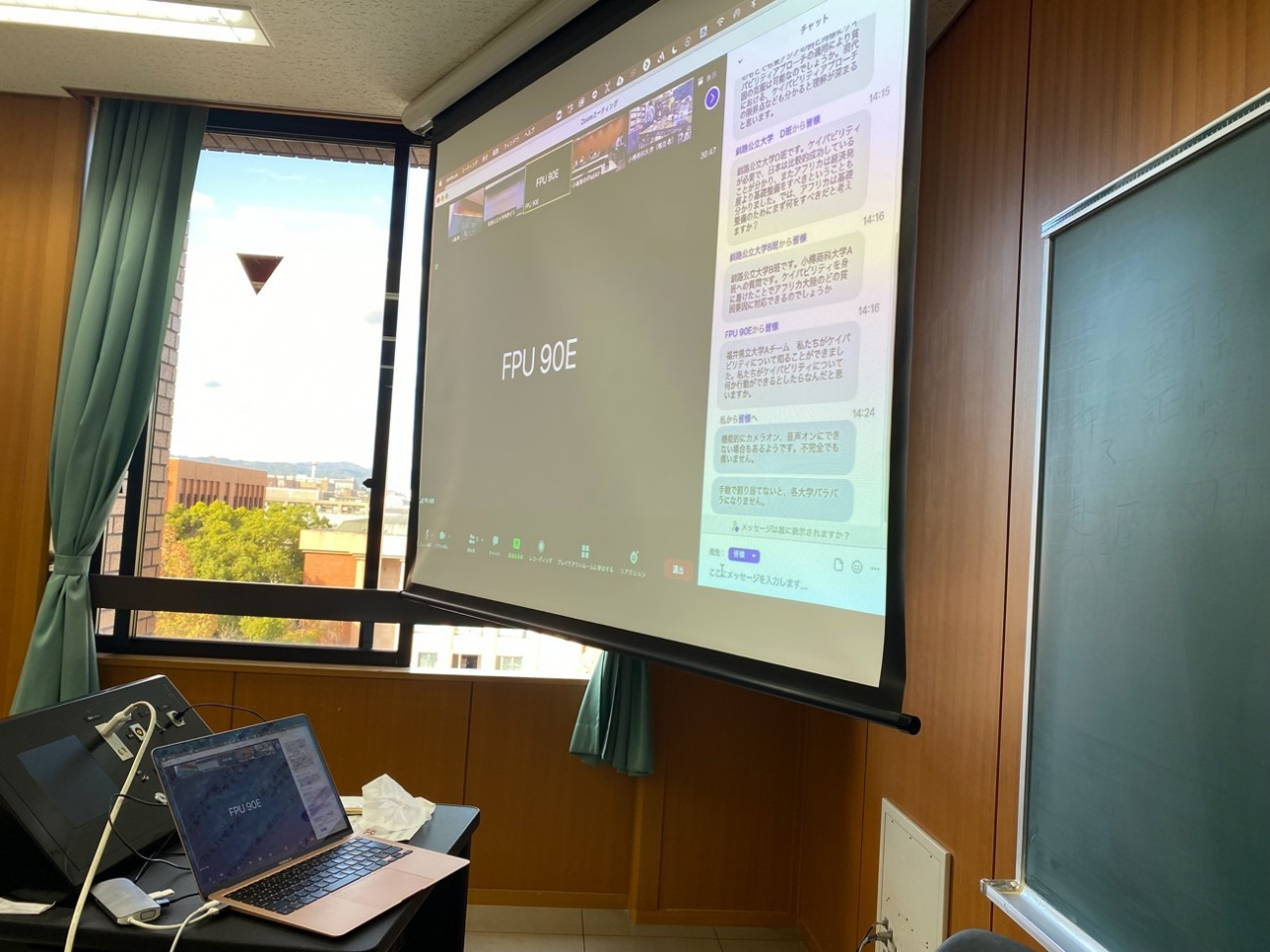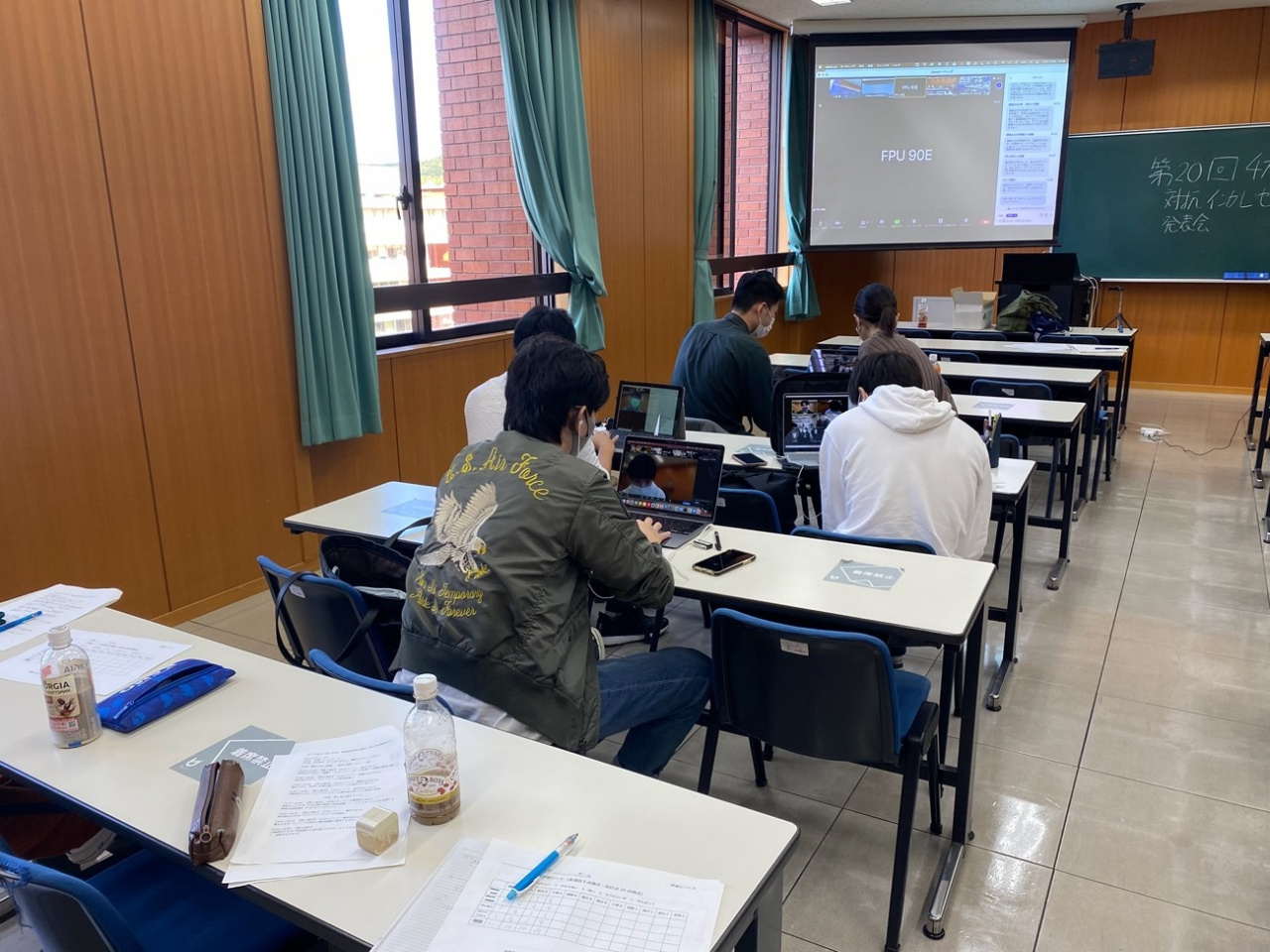 事前収録の動画と詳しいレジュメを当日までに配布しつつ、四大学約60人の学生が日頃の研鑽を披露しました。各大学は感染防止に努めながら、広い教室に集まって他大学の発表をプロジェクタで見守り、一部の学生は自宅からアクセスしていました。