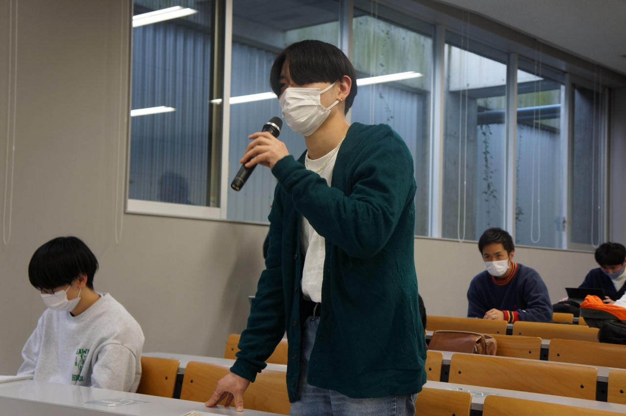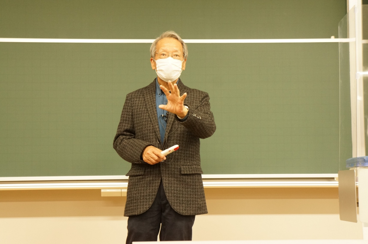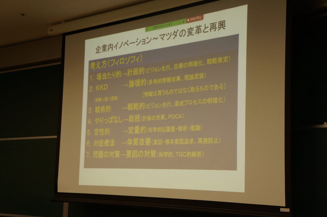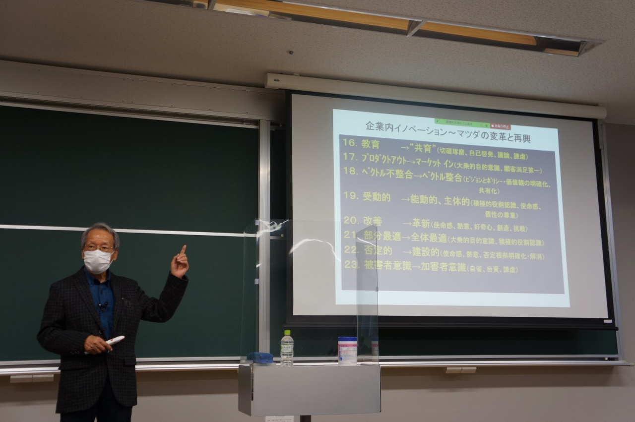 12月3日の日本経済論(担当:伊達浩憲教授)の講義では、NPO法人コアネット会員で、元マツダ株式会社執行役員・本社工場長の神谷 宏氏をゲストにお招きして、「企業内イノベーション―マツダの変革と再興」をテーマに、1990年代のバブル崩壊以降の同社の開発・製造戦略の転換について丁寧に講義していただきました。
