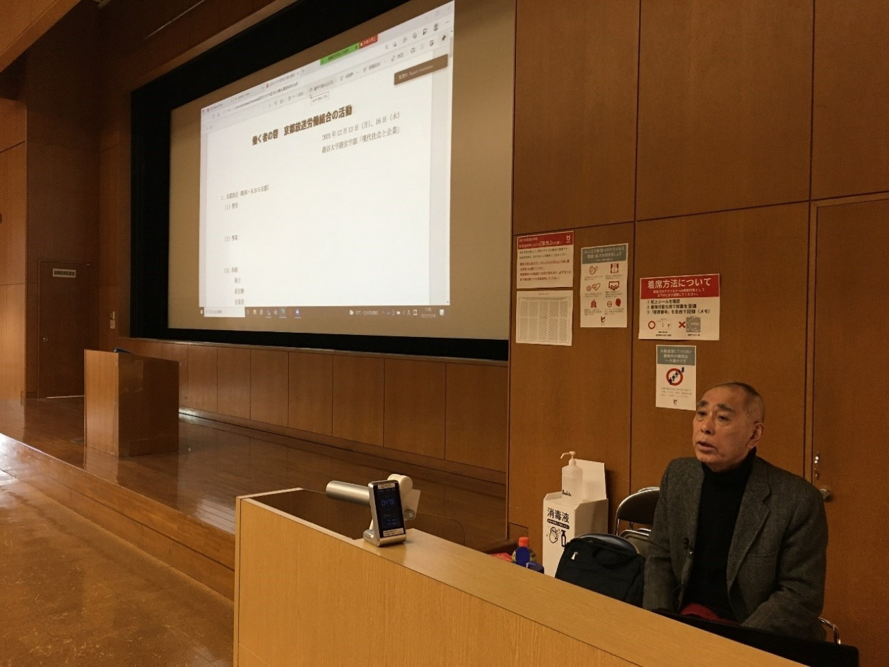 経営学部の専攻基礎科目の一つである「現代社会と企業」では、ワークルール教育を位置付けています。その一環で、今年度も民放労連京都放送労働組合の古住公義副委員長にご講演いただきました(12月13日と16日)。