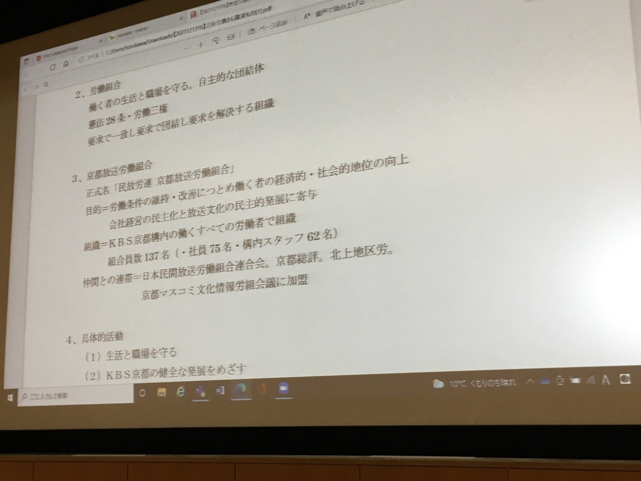 京都放送労働組合に講演をお願いしているのは、①京都放送の再建において労働組合が大きな(中心的な)役割を果たした、②非正規雇用の正規雇用化の取り組みにおいて先進的な(全国的に見て稀有な)取り組みを進めている、という二つの理由からです。