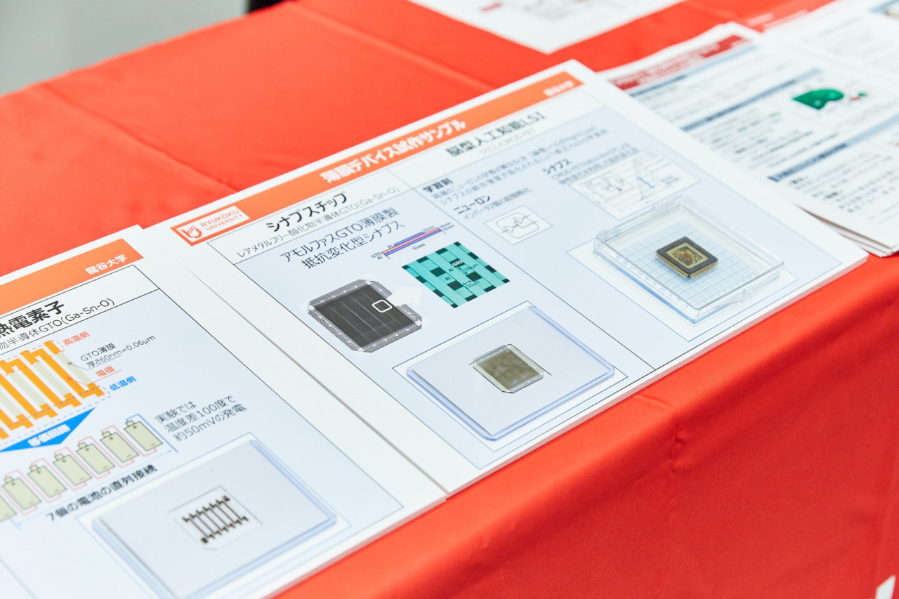 さらに、Society5.0に必要なIoTやAIへの応用研究も進め、IoT分野では低コストで実用的な熱発電素子と、AI分野では薄膜メモリスタの機能をニューラルネットワークのシナプスに用いた脳型集積システムの研究成果も紹介しました。